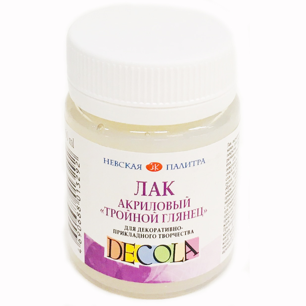Лак акриловый «тройной глянец» предназначен для финишной отделки и защитного покрытия декоративных работ в декоративно-прикладном творчестве. Применяется для создания эффекта глазури на поверхностях из дерева, картона, пластика, стекла и металла. Один слой лака заменяет 3 слоя лака акрилового глянцевого. Обладает густой консистенцией, не растекается. Не образует трещин после высыхания. Лак на основе водной акриловой дисперсии. Перед применением лак тщательно перемешать. Лак наносится кистью в один или несколько слоев с промежуточной сушкой не менее 24 часов при комнатной температуре. Окончательная просушка лака на декорируемой поверхности происходит в течение суток. При разбавлении водой уменьшается прочность плёнки лака. При попадании на кожу смыть теплой водой с мылом, не допуская высыхания лака. Кисти и инструменты сразу после работы промыть водой. Хранить в плотно закрытой таре при температуре от 5 °С до 35 °С. Состав: акриловая дисперсия, вода, добавки.