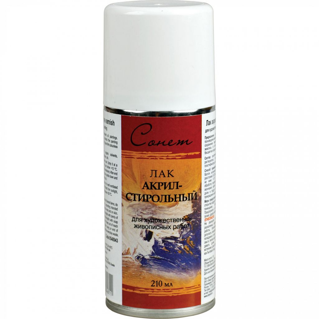 Лак акрил-стирольный для художественно-живописных работ "Сонет". Предназначен для покрытия законченных произведений масляной живописи. Способствует сохранению яркости цвета, предохраняет живопись от влаги и пыли. Даёт прочное бесцветное покрытие. Состав: синтетические смолы, органические растворители, углеводородный пропеллент, пластификаторы, масла. Способ применения: Перед применением баллон интенсивно встряхнуть. Распылять с расcтояния 15-20 см. Применять при температуре не ниже +15С. В случае необходимости обработку повторить через 20 - 25 минут. После окончания работы баллон перевернуть вверх дном и продуть распылительную головку до прекращения выхода лака.