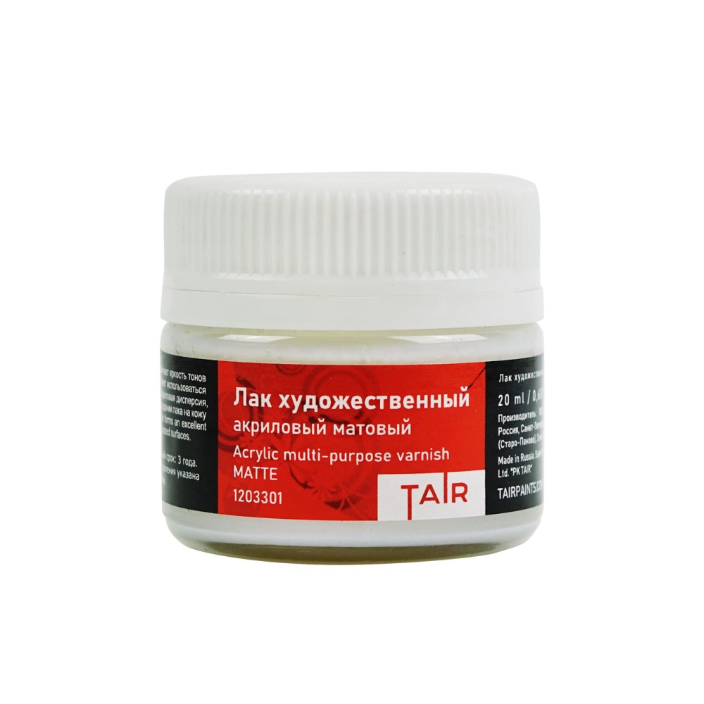Акриловый художественный лак. Образует прочное, однородовое матовое покрытие. Смягчает яркость тонов красок, защищает от воздействия внешней среды., защищает от воздействия внешней среды, широко используется для лакировки готовых изделий, выполненных в разных декоративных техниках. Также может использоваться не только для финишного покрытия поверхности, но и в качестве грунтовки или для разбавления акриловых красок. Это прозрачный водный лак на основе бесцветной непигментированной акриловой смолы с добавлением стабилизирующих и загущающих веществ. Состав: акриловая дисперсия, матирующая добавка, загуститель, консервант, вода.