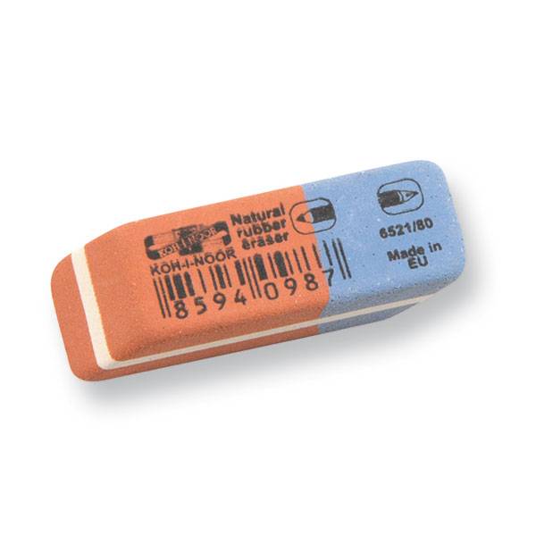Комбинированный ластик из натурального каучука. Красная сторона — для мягких графитовых карандашей, синяя сторона — для цветных и твердых графитовых карандашей, а также чернил и шариковых ручек. При стирании не повреждает бумагу, не оставляет грязных следов.