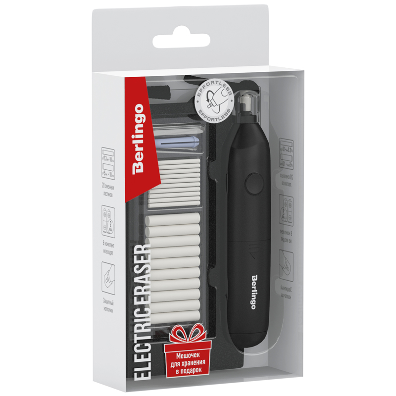 Электрический ластик Berlingo идеален для выполнения художественных работ, позволяет очень быстро и точно корректировать чертежи и эскизы, а также создавать блики на карандашных рисунках без смазывания линий. Ластик работает от 2 батареек ААА ( батарейки не входят в комплект). Мощность ластика - 12 000 оборотов в минуту. Защитный колпачок препятствует попаданию пыли и грязи. В комплекте 20 сменных ластиков разной толщины: 2,3мм - 10шт, 5мм - 10шт. Электрический ластик Berlingo поставляется в PVC боксе с европодвесом. Мешочек для хранения идет в подарок!