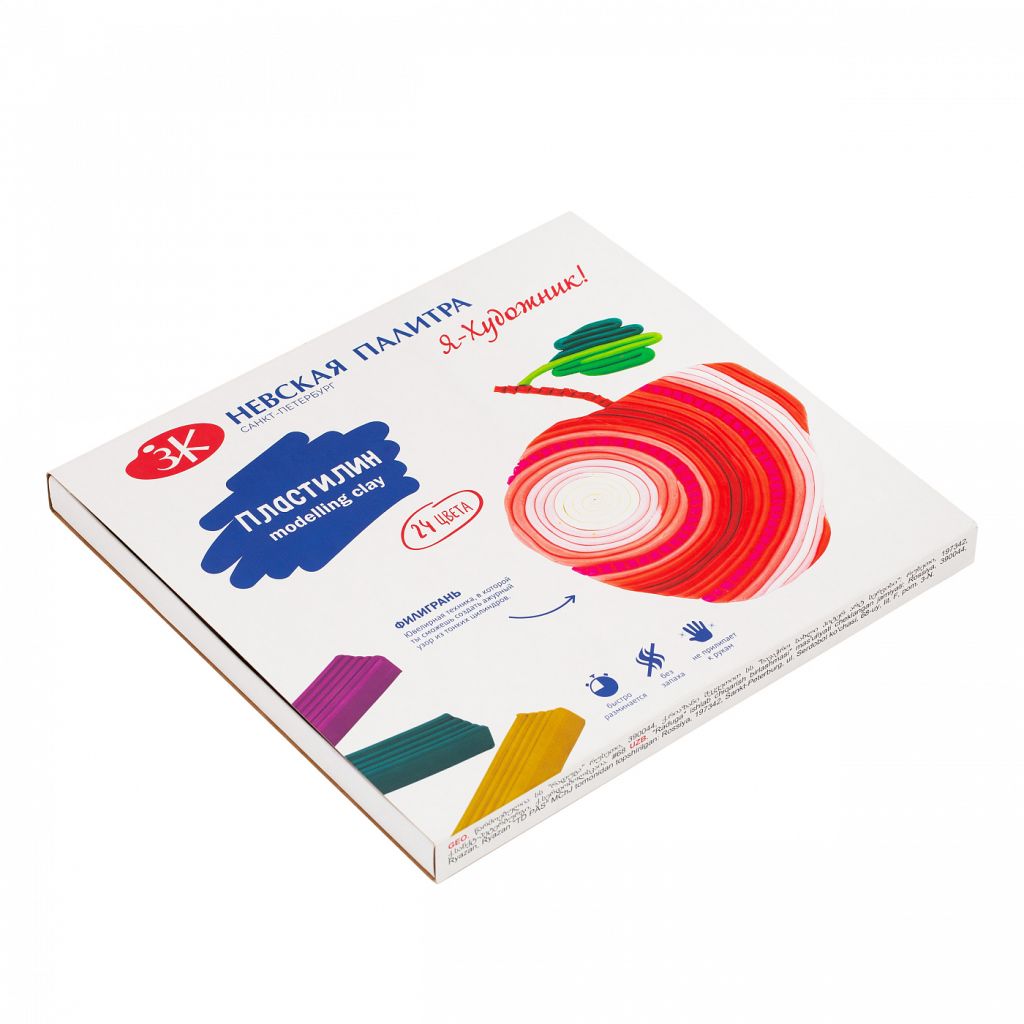 Мягкая текстура легко разминается в руках. Пластилин легко очищается с рабочих поверхностей, безопасен при длительном контакте с кожей ребенка. В наборе есть стек для моделирования. Состав: красный, лиловый, фиолетовый, светло-сиреневый, сиреневый, голубой, синий, ультрамарин, салатовый, оливковый, зелёный, изумрудный, охра, светло-коричневый, красно-коричневый, серый, черный.