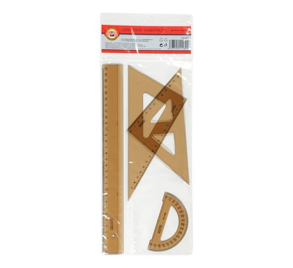 Геометрический набор Koh-i-Noor включает все, что необходимо школьнику на уроках математики: угольник 45x45x90 градусов с разметкой до 12 см; угольник 30x60x90 градусов с разметкой до 17 см; линейку на 30 см; транспортир. Составляющие набора сделаны из пластика дымчатого цвета.