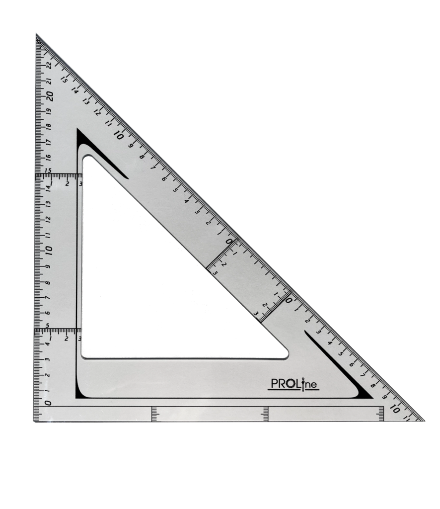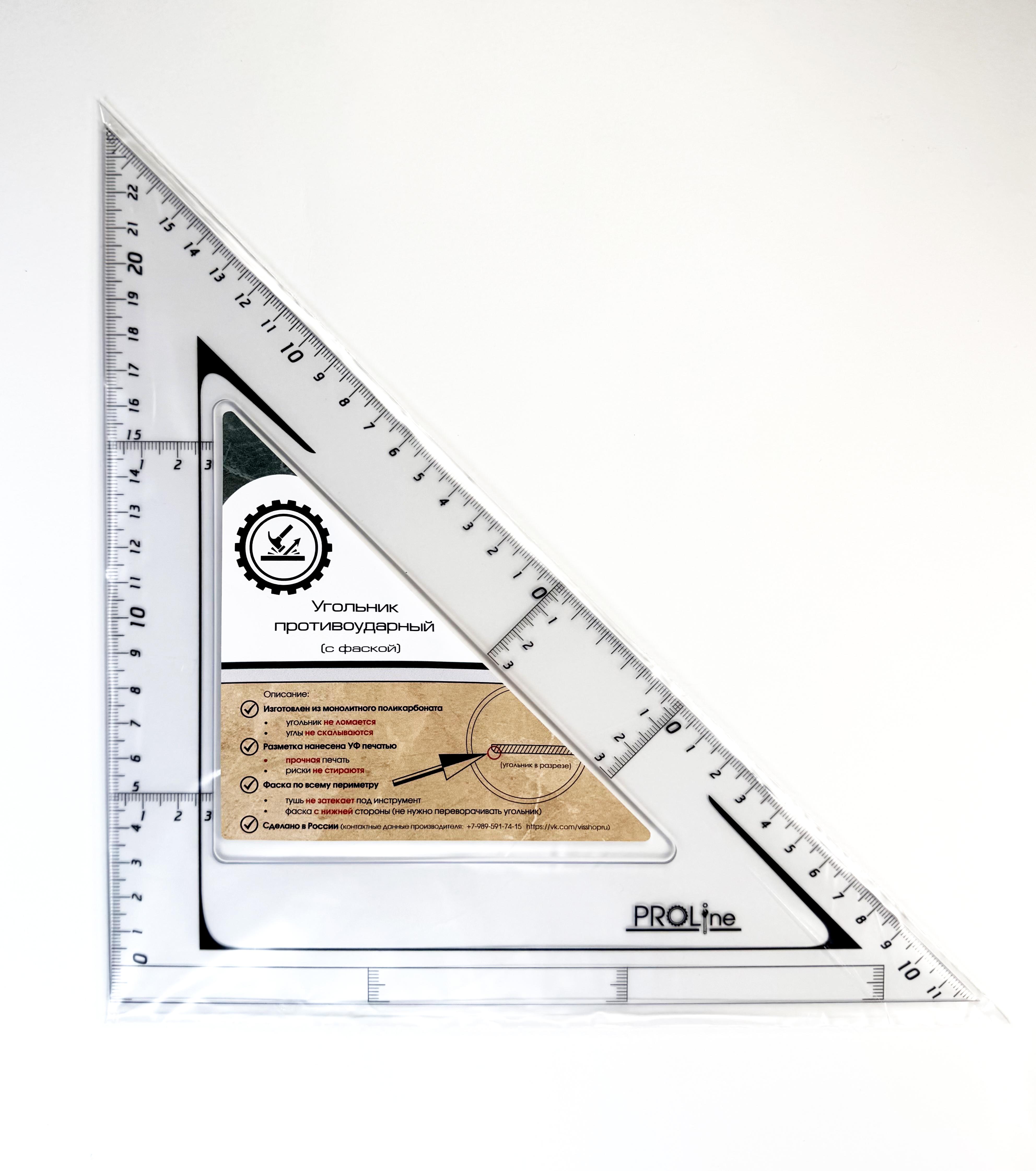 Материал: прозрачный монолитный поликарбонат. Особенности: Уникальные функции Угольник имеет фаски с нижней стороны по всему периметру, что позволяет чертить изографом или рапидографом, не переворачивая инструмент и не боясь, что тушь затечёт под угольник. Есть отступ от края величиной 1 см. с разметкой, что позволяет измерять как от нуля так и от края угольника. Нулевая риска продлена вдоль всего угольника для гораздо более удобного черчения и измерения перпендикулярных линий. Наличие перпендикуляров через каждые 10 см. и разметки на гипотенузе. Удобная глазу разметка. Каждый целый размер (такой как 10, 20 и т.д.) выделен большим шрифтом, а размеры с цифрой 5 на конце (5, 15 и т.д.) выделены перпендикуляром. Такое деление позволяет быстро находить нужный размер и не путаться, не сильно вглядываясь в инструмент. Надёжность У данных угольников не скалываются углы, их разметка не стирается и они не сломаются ни при каких условиях. Так как для изготовления этих инструментов применяется твёрдый и абсолютно не ломающийся прозрачный материал. Разметка нанесена с помощью ультрафиолетовой печати, которая является самым прочным видом печати.