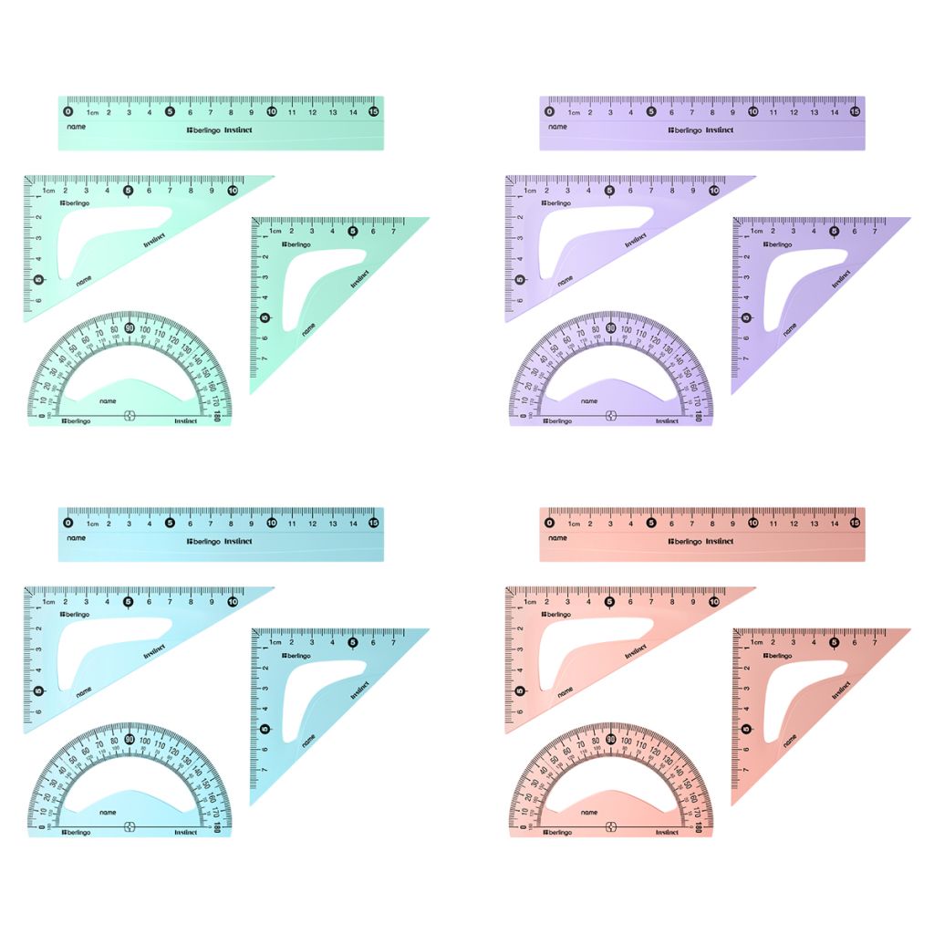 Пластиковый чертежный набор Berlingo выполнен в стиле кросс-серии Instinct: сочетание пастельных цветов с контрастным черным. В состав набора входят: линейка 15 см, треугольник 30°/60°, треугольник 45°/45°, транспортир 180°. Эргономичный дизайн позволяет избежать смазанных линий при черчении. Безопасные округлые края и качественная градуировка, выполненная с использованием УФ-чернил для наилучшей устойчивости, обеспечивают комфортное использование набора. Цвет товара представлен без возможности выбора, он будет случайным.