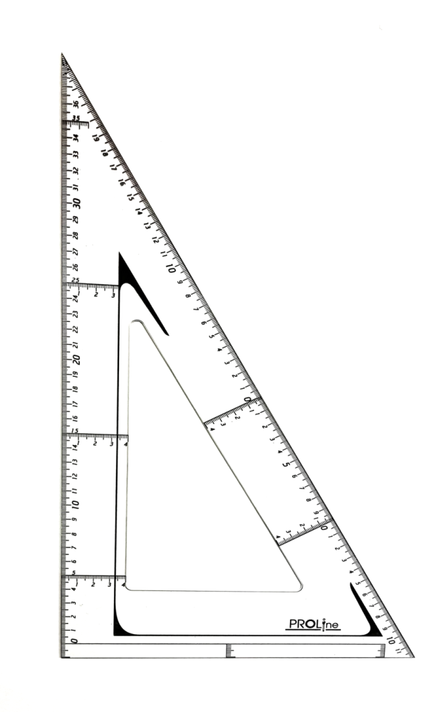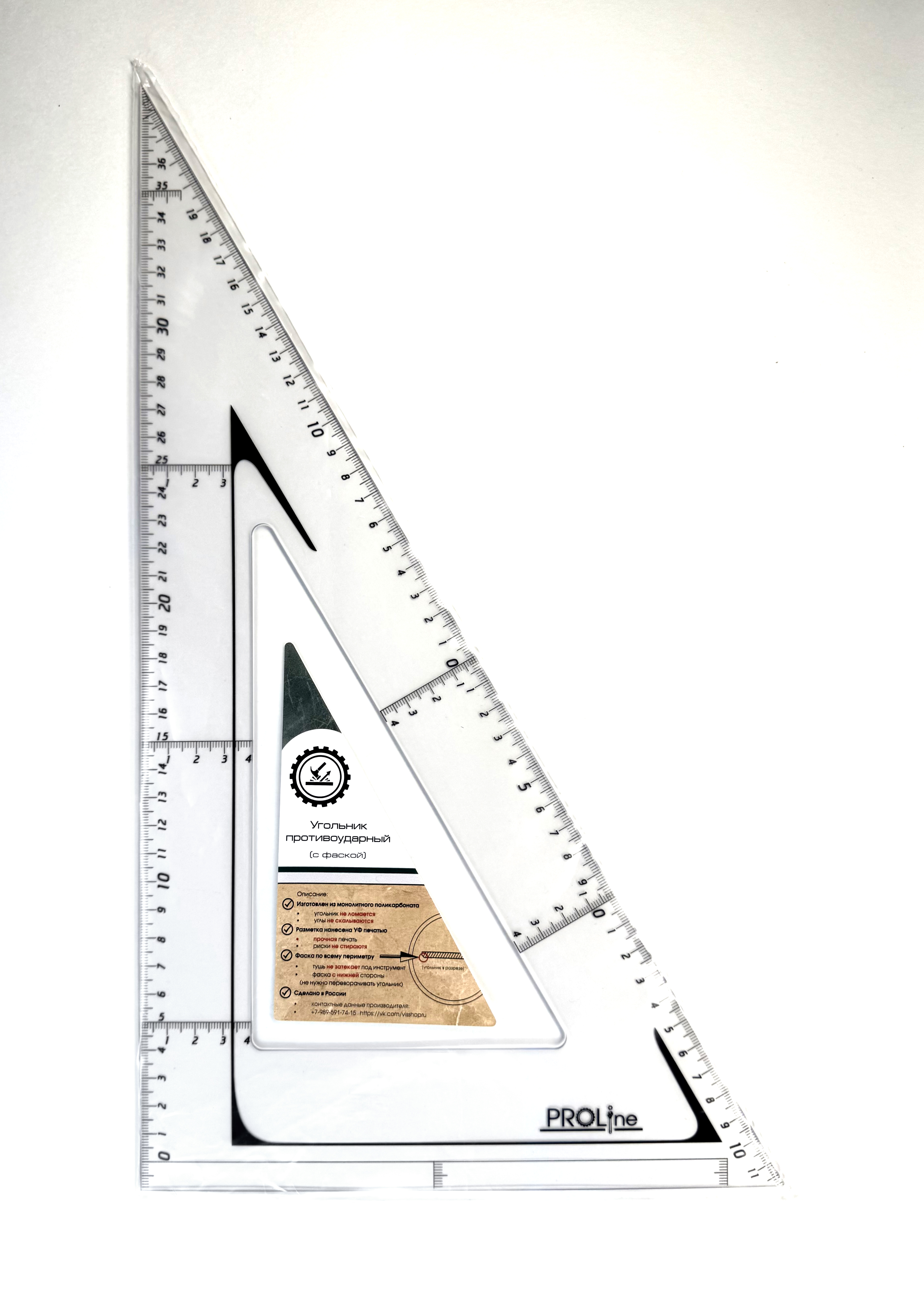 Материал: прозрачный монолитный поликарбонат. Особенности: Уникальные функции Угольник имеет фаски с нижней стороны по всему периметру, что позволяет чертить изографом или рапидографом, не переворачивая инструмент и не боясь, что тушь затечёт под угольник. Есть отступ от края величиной 1 см. с разметкой, что позволяет измерять как от нуля так и от края угольника. Нулевая риска продлена вдоль всего угольника для гораздо более удобного черчения и измерения перпендикулярных линий. Наличие перпендикуляров через каждые 10 см. и разметки на гипотенузе. Удобная глазу разметка. Каждый целый размер (такой как 10, 20 и т.д.) выделен большим шрифтом, а размеры с цифрой 5 на конце (5, 15 и т.д.) выделены перпендикуляром. Такое деление позволяет быстро находить нужный размер и не путаться, не сильно вглядываясь в инструмент. Надёжность У данных угольников не скалываются углы, их разметка не стирается и они не сломаются ни при каких условиях. Так как для изготовления этих инструментов применяется твёрдый и абсолютно не ломающийся прозрачный материал. Разметка нанесена с помощью ультрафиолетовой печати, которая является самым прочным видом печати.