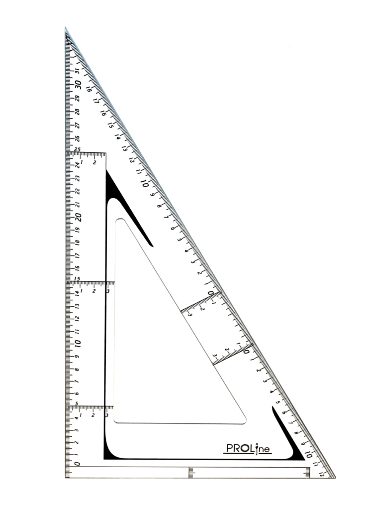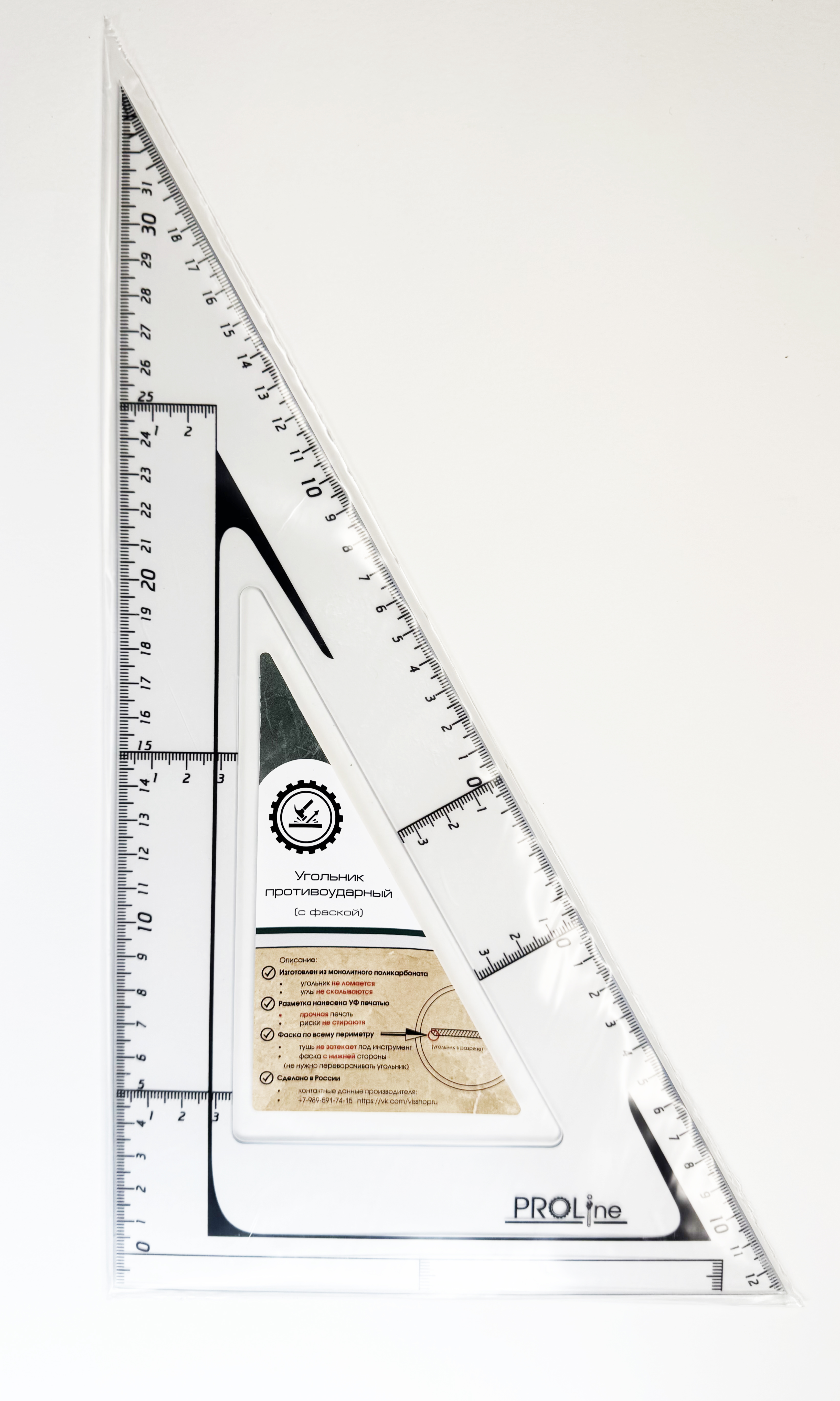 Материал: прозрачный монолитный поликарбонат. Особенности: Уникальные функции Угольник имеет фаски с нижней стороны по всему периметру, что позволяет чертить изографом или рапидографом, не переворачивая инструмент и не боясь, что тушь затечёт под угольник. Есть отступ от края величиной 1 см. с разметкой, что позволяет измерять как от нуля так и от края угольника. Нулевая риска продлена вдоль всего угольника для гораздо более удобного черчения и измерения перпендикулярных линий. Наличие перпендикуляров через каждые 10 см. и разметки на гипотенузе. Удобная глазу разметка. Каждый целый размер (такой как 10, 20 и т.д.) выделен большим шрифтом, а размеры с цифрой 5 на конце (5, 15 и т.д.) выделены перпендикуляром. Такое деление позволяет быстро находить нужный размер и не путаться, не сильно вглядываясь в инструмент. Надёжность У данных угольников не скалываются углы, их разметка не стирается и они не сломаются ни при каких условиях. Так как для изготовления этих инструментов применяется твёрдый и абсолютно не ломающийся прозрачный материал. Разметка нанесена с помощью ультрафиолетовой печати, которая является самым прочным видом печати.