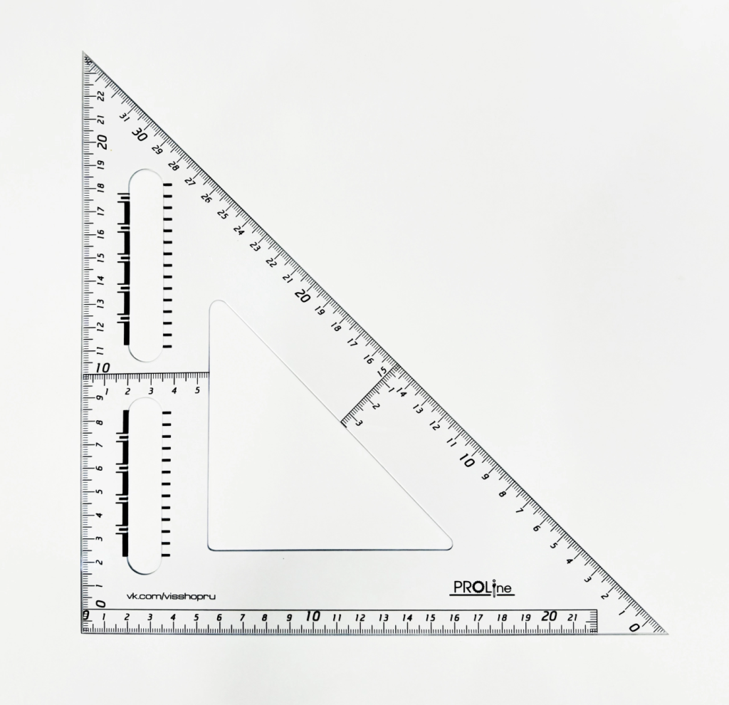 Материал: прозрачный монолитный поликарбонат. Особенности: Уникальные функции Разметка под штриховые ( невидимые линии ) и штрих -пунктирные ( осевые ) находящиеся в прорезях угольника. Штриховые линии (невидимые) имеют размеры : Штрих 4 мм , между штрихами 1 мм Штрих пунктирные линии(осевые) имеют размеры : Штрих 10 мм , между штрихами 1 мм. Угольник имеет фаски с нижней стороны по всему периметру, что позволяет чертить изографом или рапидографом, не переворачивая инструмент и не боясь, что тушь затечёт под угольник. Есть отступ от края величиной 1 см. с разметкой, что позволяет измерять как от нуля так и от края угольника. Нулевая риска продлена вдоль всего угольника для гораздо более удобного черчения и измерения перпендикулярных линий. Наличие перпендикуляров через каждые 10 см. и разметки на гипотенузе. Удобная глазу разметка. Каждый целый размер (такой как 10, 20 и т.д.) выделен большим шрифтом, а размеры с цифрой 5 на конце (5, 15 и т.д.) выделены перпендикуляром. Такое деление позволяет быстро находить нужный размер и не путаться, не сильно вглядываясь в инструмент. Надёжность У данных угольников не скалываются углы, их разметка не стирается и они не сломаются ни при каких условиях. Так как для изготовления этих инструментов применяется твёрдый и абсолютно не ломающийся прозрачный материал. Разметка нанесена с помощью ультрафиолетовой печати, которая является самым прочным видом печати.