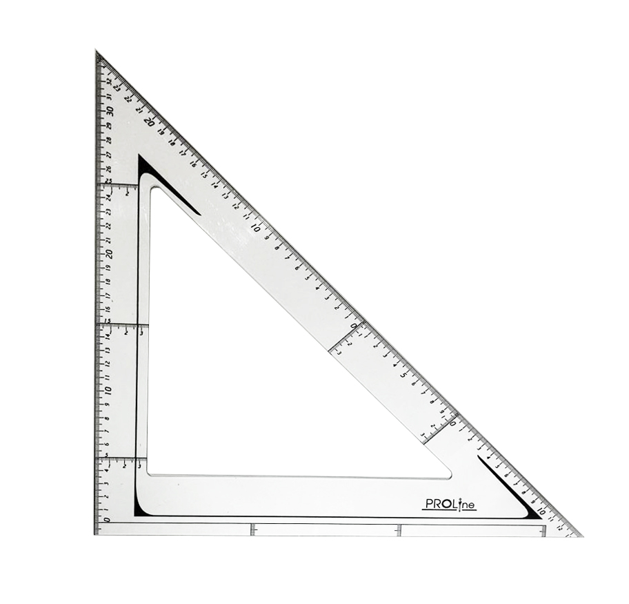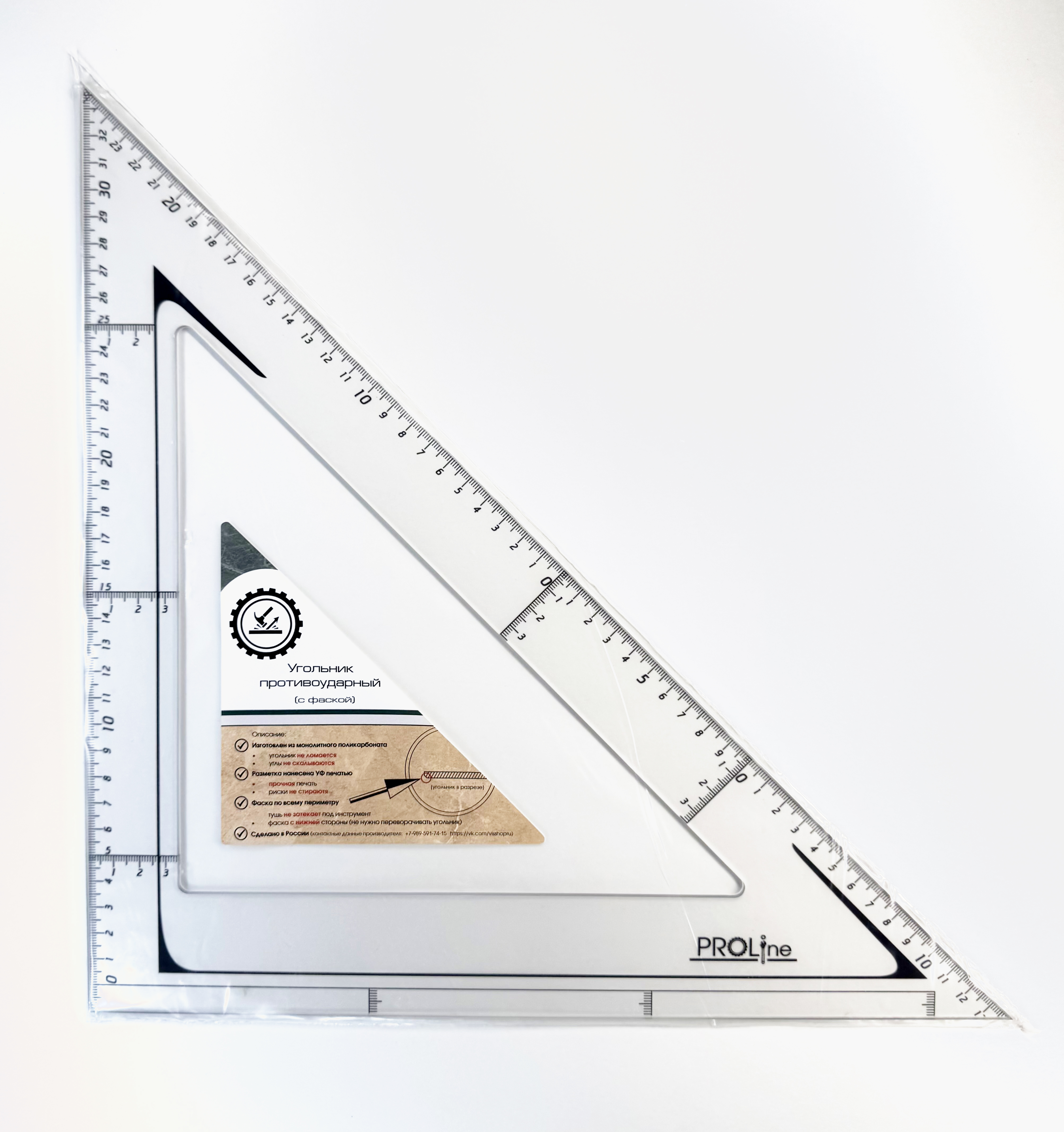 Материал: прозрачный монолитный поликарбонат. Особенности: Уникальные функции Угольник имеет фаски с нижней стороны по всему периметру, что позволяет чертить изографом или рапидографом, не переворачивая инструмент и не боясь, что тушь затечёт под угольник. Есть отступ от края величиной 1 см. с разметкой, что позволяет измерять как от нуля так и от края угольника. Нулевая риска продлена вдоль всего угольника для гораздо более удобного черчения и измерения перпендикулярных линий. Наличие перпендикуляров через каждые 10 см. и разметки на гипотенузе. Удобная глазу разметка. Каждый целый размер (такой как 10, 20 и т.д.) выделен большим шрифтом, а размеры с цифрой 5 на конце (5, 15 и т.д.) выделены перпендикуляром. Такое деление позволяет быстро находить нужный размер и не путаться, не сильно вглядываясь в инструмент. Надёжность У данных угольников не скалываются углы, их разметка не стирается и они не сломаются ни при каких условиях. Так как для изготовления этих инструментов применяется твёрдый и абсолютно не ломающийся прозрачный материал. Разметка нанесена с помощью ультрафиолетовой печати, которая является самым прочным видом печати.