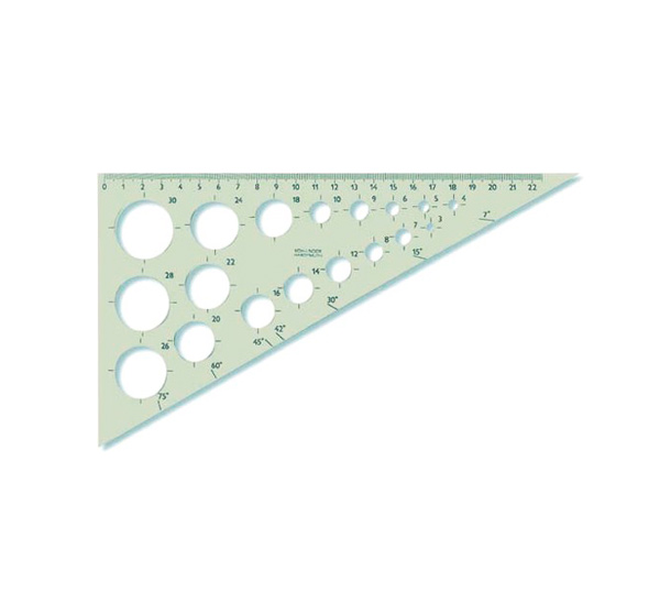 Универсальный пластиковый прозрачный угольник Koh-i-Noor. Длина стороны 22см, с ценой деления 1мм. Оригинальность угольника заключается в встроенных в его корпус окружностях разных диаметров для различных чертежных и графических работ.