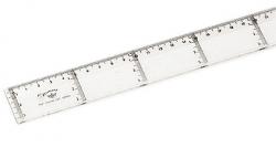 Линейка пластиковая для профессиональных чертёжных работ. Чёрными чернилами и засечками отмечен шаг в 1 мм, также присутствуют вертикальные шкалы для удобства рисования параллельных линий. Длина: 30 см.