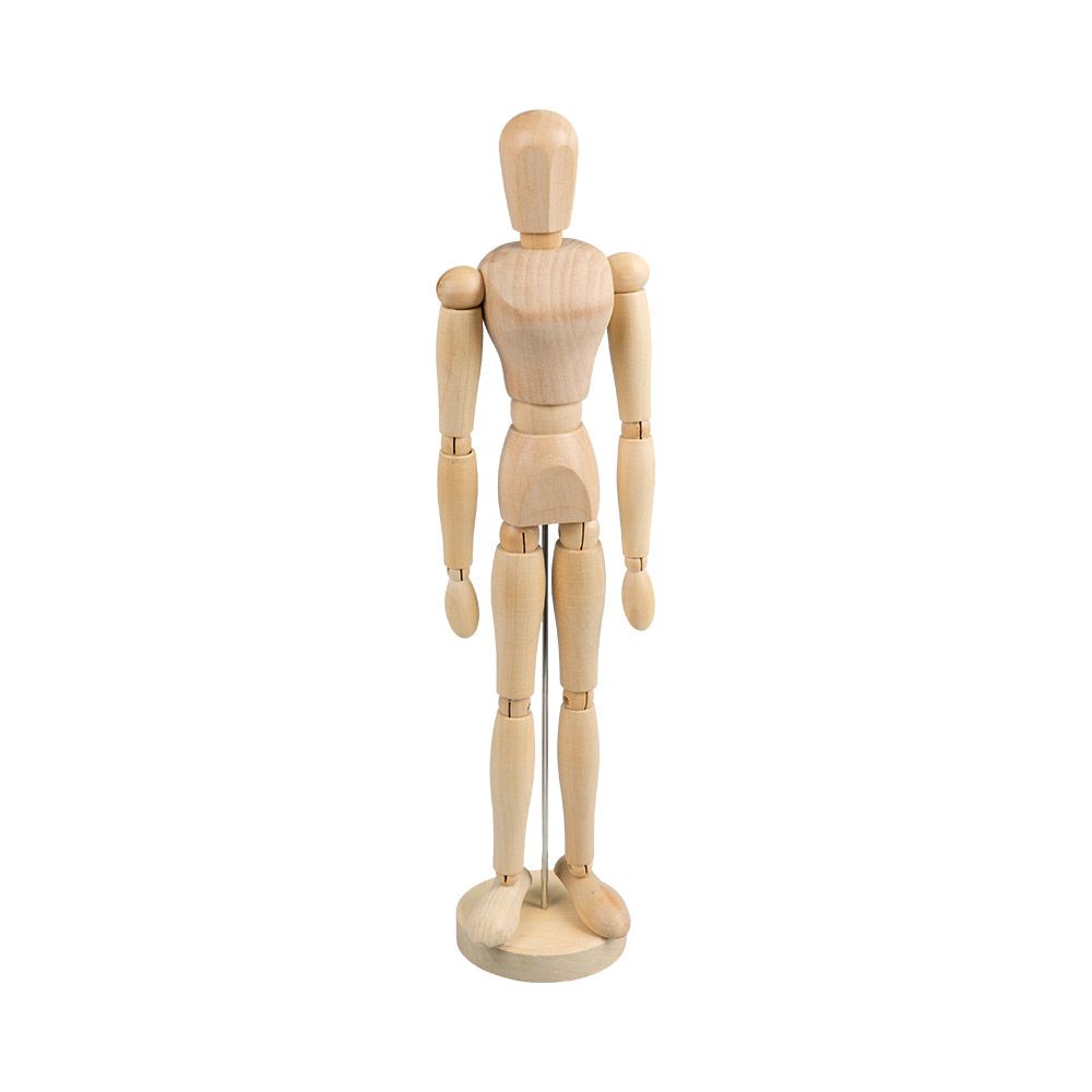 Манекен человека женщина, стоит на круглой подставке/основе, поддерживаемый металлической опорой сзади. Высота манекена - 40 см. Высота подставки/основы - 1.5 см. Материал: древесина. Манекен человека представляет собой куклу, изображающую человеческий силуэт/фигуру с подвижными деталями: руками, ногами, головой и телом. Детали между собой скрепляются металлическими болтиками и пружинками, что предоставляет возможность зафиксировать манекен в необходимом положении. Деревянные манекены используют любители, начинающие художники, художники как наглядное пособие для отработки зарисовки частей тела человека, а также силуэт/фигуру человека в различных позах.