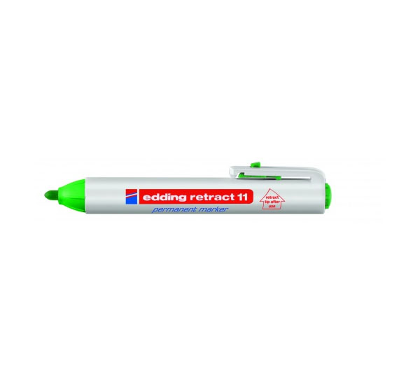 Маркеры перманентные EDDING «11» (Эддинг «11») изготавливаются одним из самых известных производителей маркеров в мире - компанией «EDDING». Она была основана в 1960 году в Гамбурге (Германия). Изначально компания производила предметы для планирования и визуализации бизнес-процессов, но в дальнейшем сменила направленность своей работы и начала профессионально выпускать маркеры и сопутствующие товары. Сегодня в лабораториях компании усилиями выдающихся химиков, технологов, инженеров создаются революционные продукты. Блестящие идеи, такие как «ультрафиолетовый маркер», «силиконовый маркер», «аэрокосмический маркер» и многие другие принадлежат именно компании «Edding». Особое внимание уделяется контролю качества продукции. Производство сертифицировано в соответствии с требованиями международных стандартов системы управления качеством DIN EN ISO 9001. Маркеры перманентные EDDING «11» предназначены для нанесения надписей на различные гладкие поверхности. Они отличаются от других маркеров отсутствием колпачка и наличием кнопки. Специальный механизм позволяет маркерам не высыхать долгое время. При нажатии на кнопку из корпуса выдвигается наконечник маркера, при повторном нажатии наконечник убирается в корпус. Маркеры хорошо ложатся на такие поверхности, как металл, дерево, стекло, пластик, керамика, плёнка, кафель. Чернила маркеров EDDING «11» изготавливаются на спиртовой основе. Надписи, нанесённые этими маркерами, не выцветают и не смываются водой со временем. Маркеры перманентные EDDING «11» оснащены круглым наконечником толщиной 1,5-3 мм (в зависимости от наклона). Выпускаются поштучно в четырёх различных цветах: чёрном, красном, синем и зелёном.
