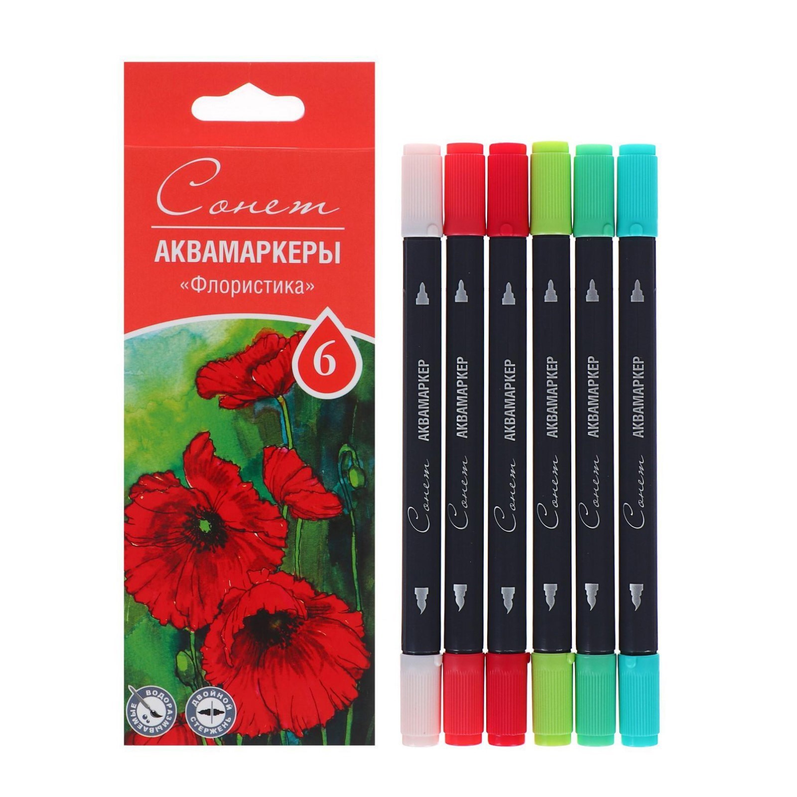 Водорастворимые светостойкие аквамаркеры "Сонет" предназначены для живописи, рисования, работы в смешанных техниках. Прекрасно совмещают себе свойства маркеров и акварельных красок. Имеют яркие и насыщенные цвета, которые превосходно смешиваются между собой. Гибкий наконечник в форме кисточки предназначен для мягкого закрашивания, тонкий стержень - для прорисовки деталей. В наборе 6 цветов: телесно-розовый, карминовый, краплак красный, изумрудный зеленый, малахит, желто-зеленый.