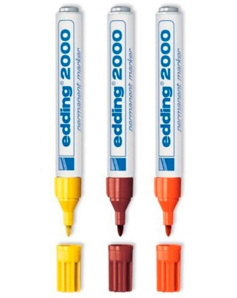 Маркеры перманентные EDDING «2000» (Эддинг «2000») изготавливаются одним из самых известных производителей маркеров в мире - компанией «EDDING». Она была основана в 1960 году в Гамбурге (Германия). Изначально компания производила предметы для планирования и визуализации бизнес-процессов, но в дальнейшем сменила направленность своей работы и начала профессионально выпускать маркеры и сопутствующие товары. Сегодня в лабораториях компании усилиями выдающихся химиков, технологов, инженеров создаются революционные продукты. Блестящие идеи, такие как «ультрафиолетовый маркер», «силиконовый маркер», «аэрокосмический маркер» и многие другие принадлежат именно компании «Edding». Особое внимание уделяется контролю качества продукции. Производство сертифицировано в соответствии с требованиями международных стандартов системы управления качеством DIN EN ISO 9001. Маркеры перманентные EDDING «2000» предназначены для нанесения надписей на различные гладкие поверхности. Они хорошо ложатся на металл, дерево, стекло, пластик, керамику. Чернила маркеров EDDING «2000» изготавливаются на спиртовой основе. При письме не требуется сильного нажима. Надписи, нанесенные этими маркерами, не выцветают и не смываются водой со временем. Маркеры перманентные EDDING «2000» оснащены круглым наконечником, толщина которого составляет 1,5-3 мм (в зависимости от наклона). Выпускаются поштучно. представлены различные цвета.