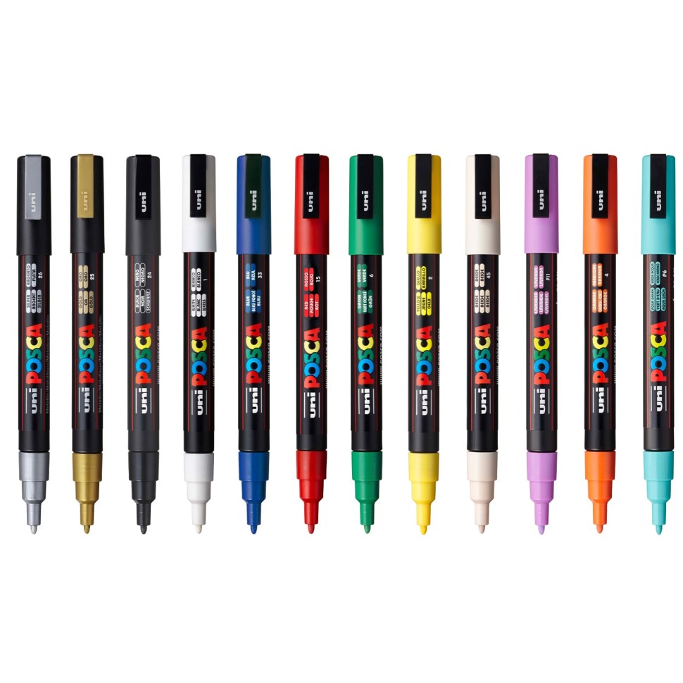 UNI POSCA — это акриловые маркеры на водной основе, предназначенные для работы на любых поверхностях. Уникальная формула матовой краски обеспечивает превосходную укрывистость и быстрое высыхание. В наборе "Standard" 12 маркеров POSCA PC-3M основной цветовой палитры. Надписи, сделанные маркерами POSCA, хорошо держатся на пористых поверхностях, таких как: древесина, картон, ткань, камень, некоторые пластмассы и металлы, краска держится постоянно без применения каких-либо закрепителей. В некоторых случаях (живопись, индивидуальное оформление, украшение) можно использовать фиксирующий лак для того, чтобы защитить ваши произведения в течение длительного периода времени. Рисунки могут быть стёрты с большинства гладких, непористых материалов, таких как стекло, ПВХ и металлические поверхности, поэтому могут быть использованы для временного оформления витрин и зеркал. При использовании маркеров на бумаге, чернила не проступают сквозь ее листы. PC-3M — одна из самых популярных моделей маркеров POSCA. Наконечник имеет овальную (пулевидную) форму и создает линию от 0,9 до 1,3 мм. Если кончик испачкался или засох его можно замочить в воде. А еще у этой модели маркеров двусторонний наконечник, поэтому, в случае деформации одной стороны, вы можете перевернуть его и вставить другой стороной и пользоваться как новым! Яркие и насыщенные цвета подойдут для любых творческих работ - рисование, декорирование, создание украшений, витражей, декораций. Маркеры идеально подходят для детского творчества, так как чернила чернила маркеров соответствуют стандарту ISO8124-3 "Безопасно для детей". Они не содержат ксилен, имеют водную основу и не имеют запаха. Вы можете быть спокойны, если вдруг маркер попадет в руки ребенка. Перед каждым применением маркер необходимо хорошенько встряхнуть.