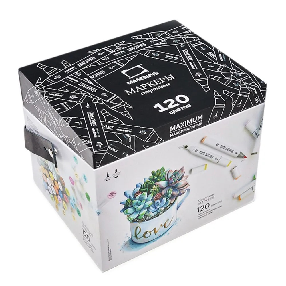 Долгожданный набор всей палитры спиртовых маркеров «Малевичъ» GrafArt Brush в удобном боксе для хранения и транспортировки. В наборе 120 цветов качественных спиртовых скетч маркеров. Маркеры двухсторонние. С одной стороны имеется перо кисть, с другой – долото. Для отличия наконечников на маркере имеется серая вставка около колпачка, а также соответствующие знаки нанесены на корпус. Корпус маркера овальный, что предотвращает его скатывание со стола. Все цвета яркие и чистые, с помощью которых получаются отличные скетчи и иллюстрации. Набор спиртовых маркеров упакован в картонный износостойкий бокс, который идеален для хранения маркеров в горизонтальном положении. Крышка бокса во время работы с маркерами служит подставкой, приподнимая коробку таким образом, чтобы маркеры не выпадали на рабочую поверхность и не мешали рисовать. Бокс не имеет внутренних разделителей, что облегчает хранение и использование. Для маркеров рекомендуем использовать специальную бумагу, чтобы получать превосходные градиенты. Маркеры можно заправлять повторно. Для заправки необходимо взять маркер без колпачков вертикально и чернила накапать на верхний наконечник до тех пор, пока не пропитается нижний наконечник.