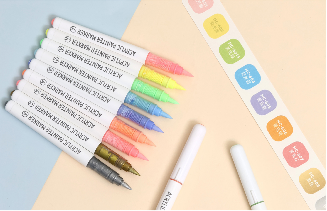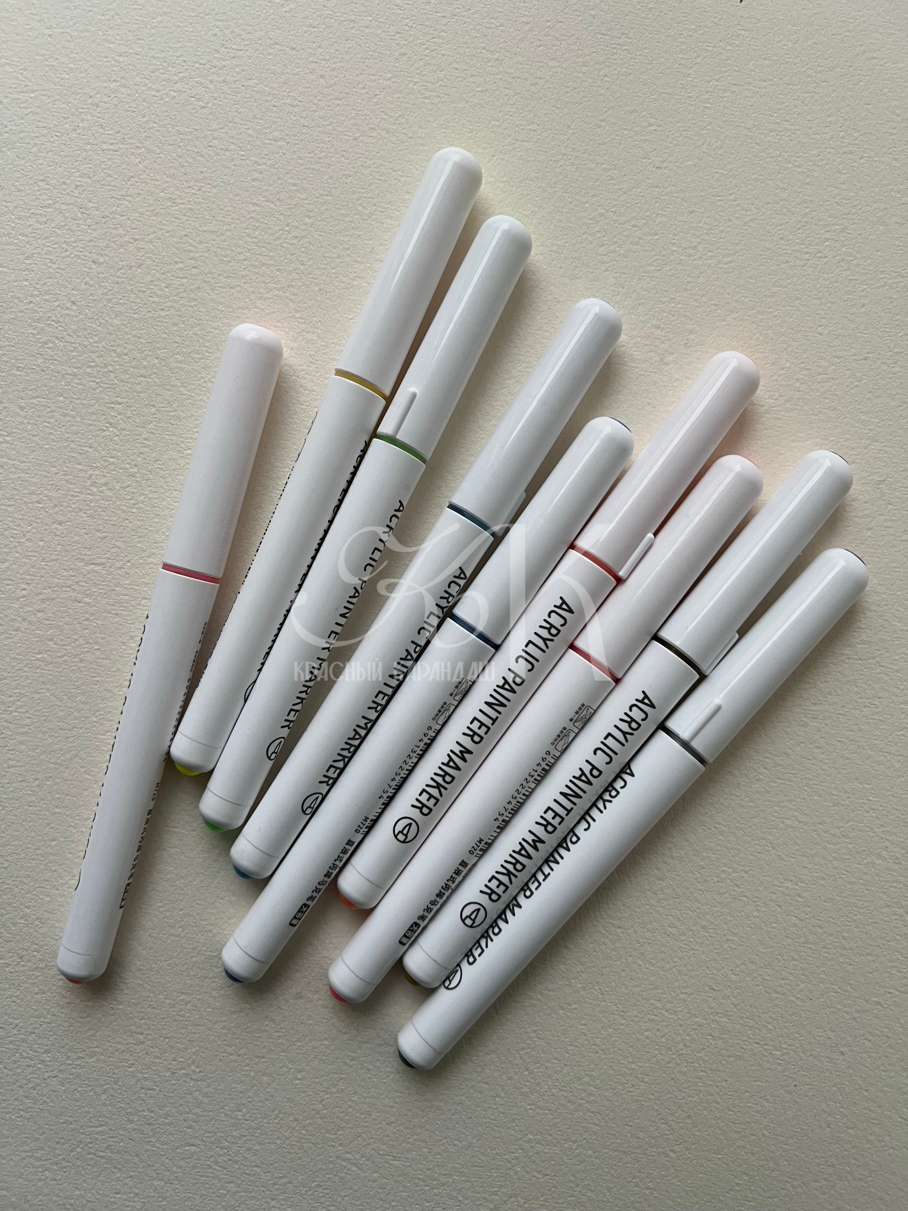 Акриловые маркеры на водной основе. Подходит для письма, рисования, декорирования. Можно использовать на любых поверхностях: холстах, бумаге, дереве, металле, картоне. Маркеры имеют высокую укрывистость с равномерным красочным слоем. После высыхания образуют плотную несмываемую плёнку. Наконечник-кисть обеспечивает линию шириной 1-3 мм.