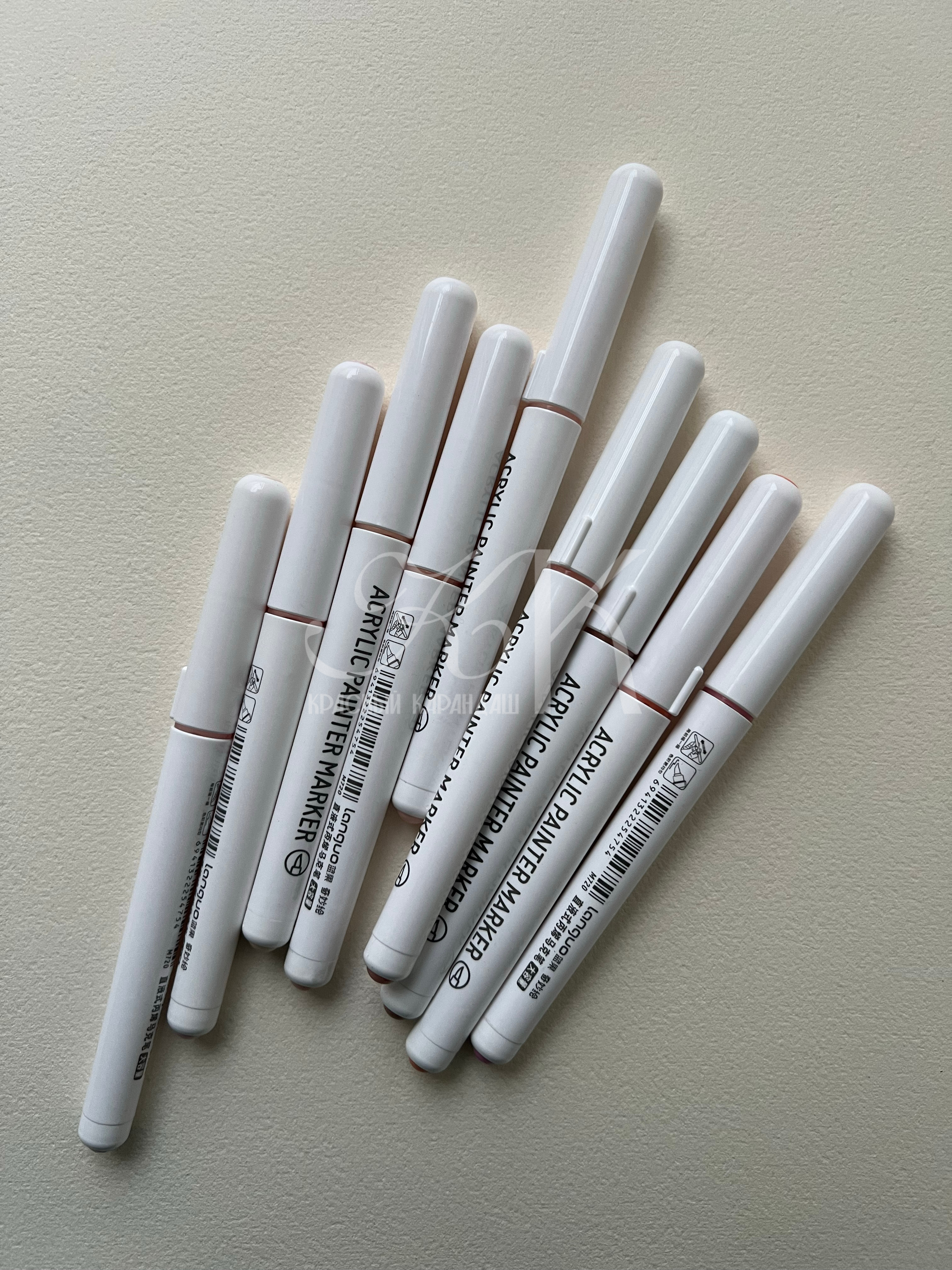 Акриловые маркеры на водной основе. Подходит для письма, рисования, декорирования. Можно использовать на любых поверхностях: холстах, бумаге, дереве, металле, картоне. Маркеры имеют высокую укрывистость с равномерным красочным слоем. После высыхания образуют плотную несмываемую плёнку. Наконечник-кисть обеспечивает линию шириной 1-3 мм.