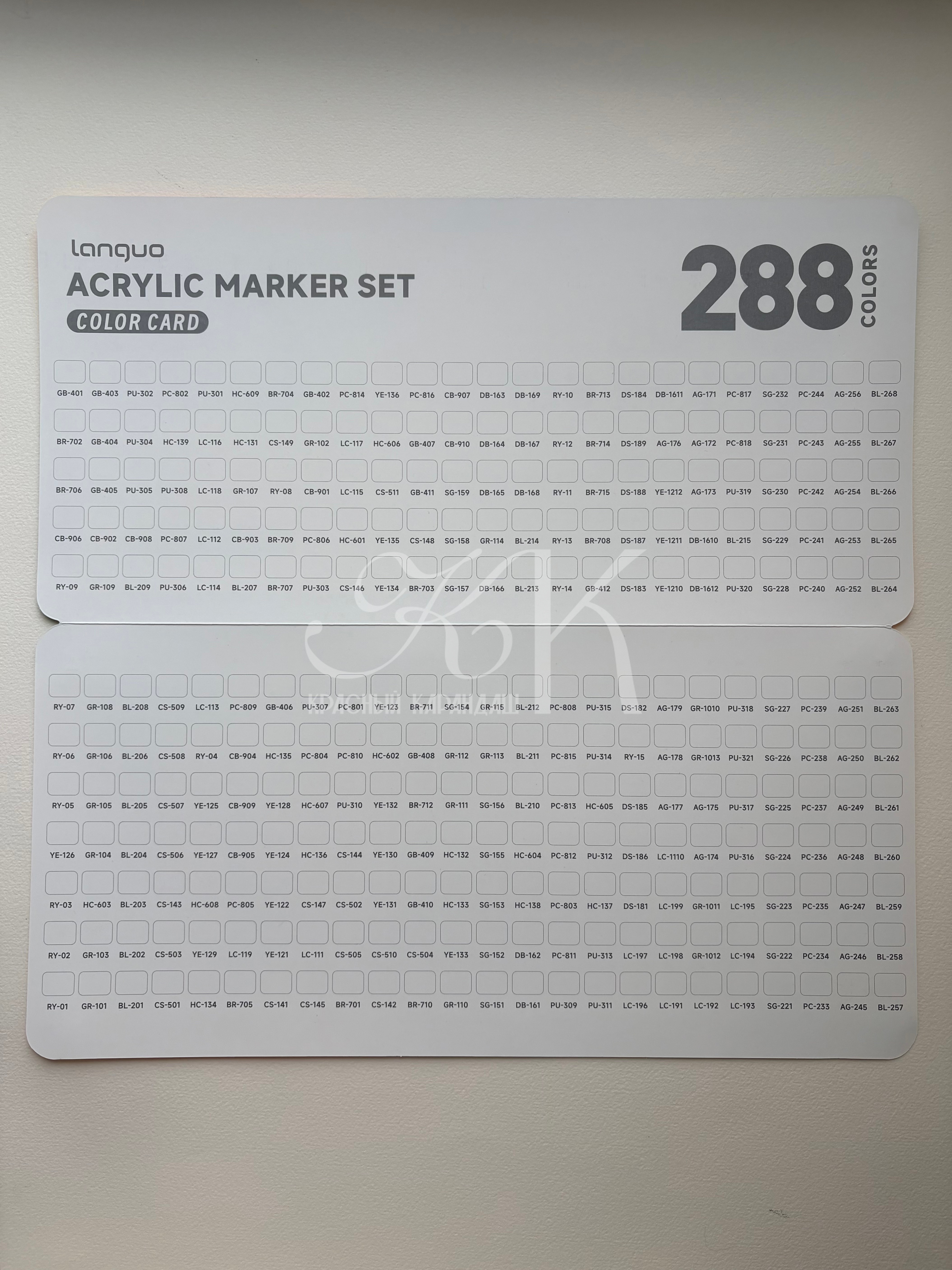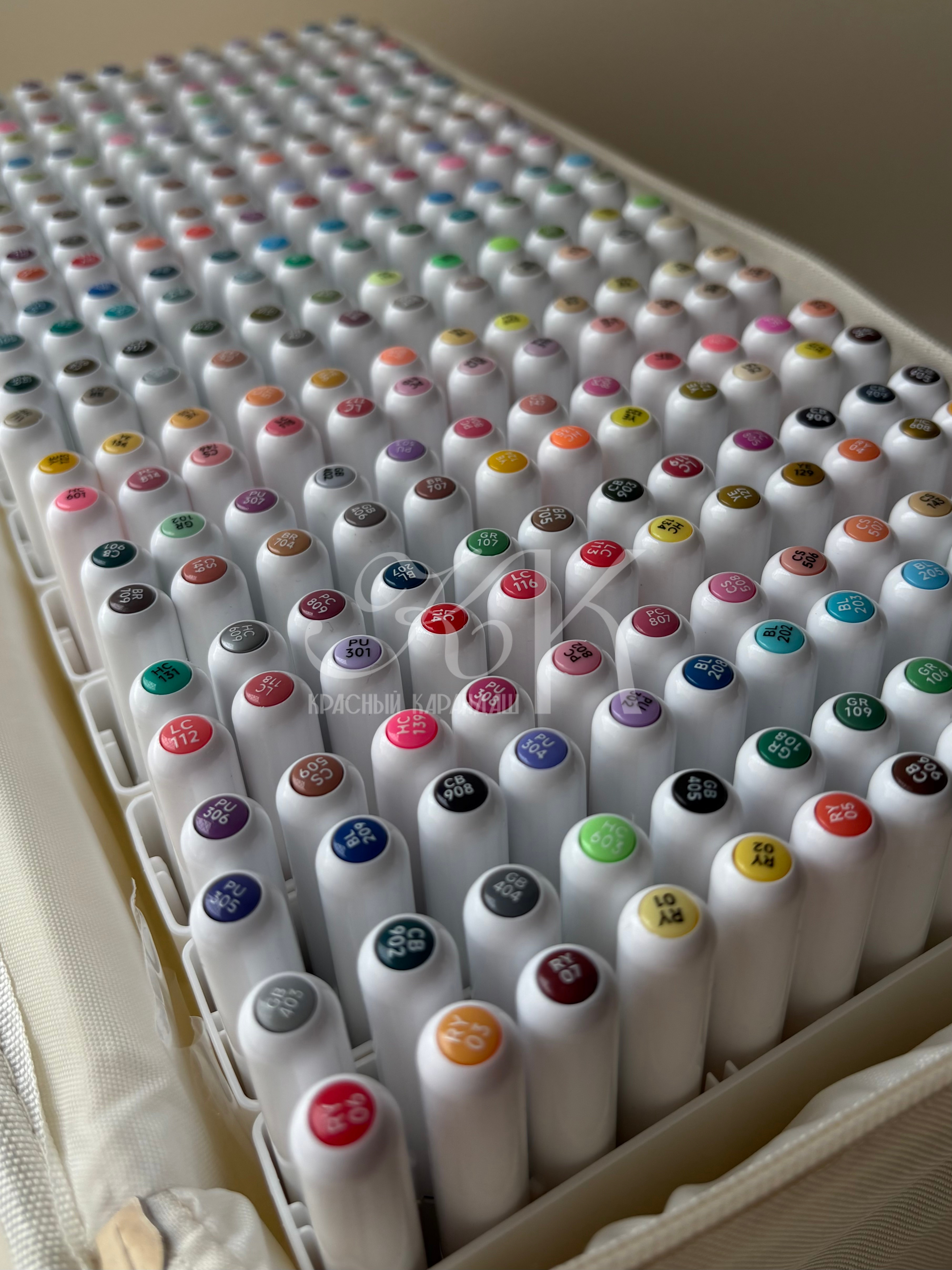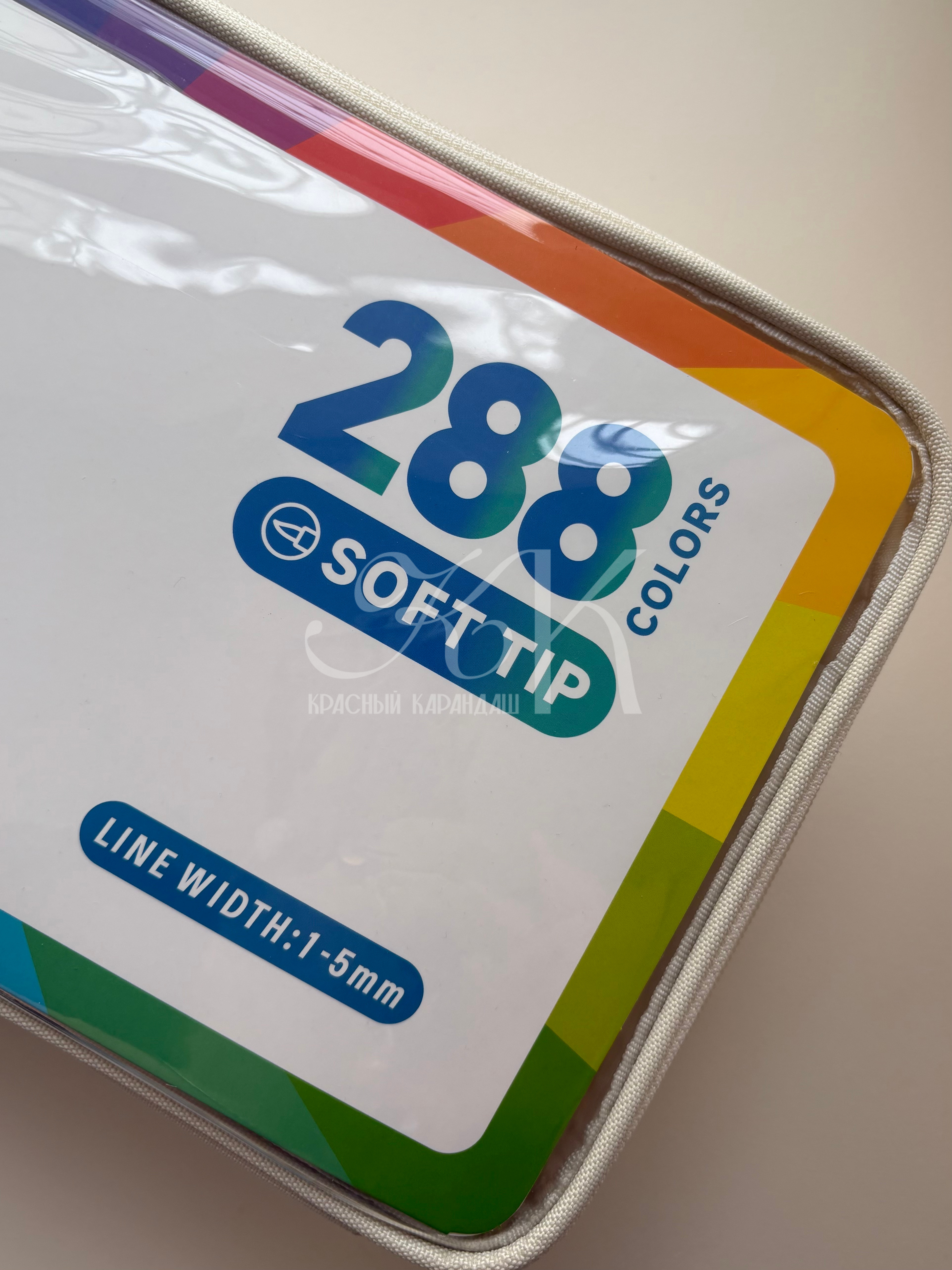 В наборе 288 акриловых маркеров на водной основе. Подходит для письма, рисования, декорирования. Можно использовать на любых поверхностях: холстах, бумаге, дереве, металле, картоне. Маркеры имеют высокую укрывистость с равномерным красочным слоем. После высыхания образуют плотную несмываемую плёнку. Наконечник-кисть обеспечивает линию шириной 1-3 мм.