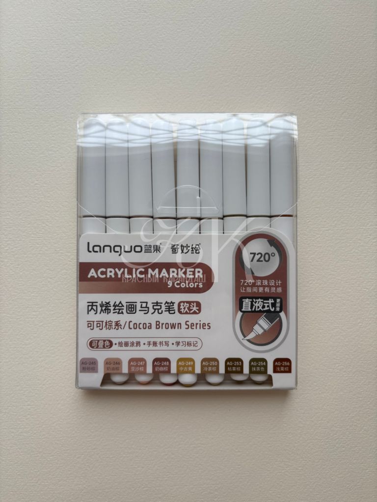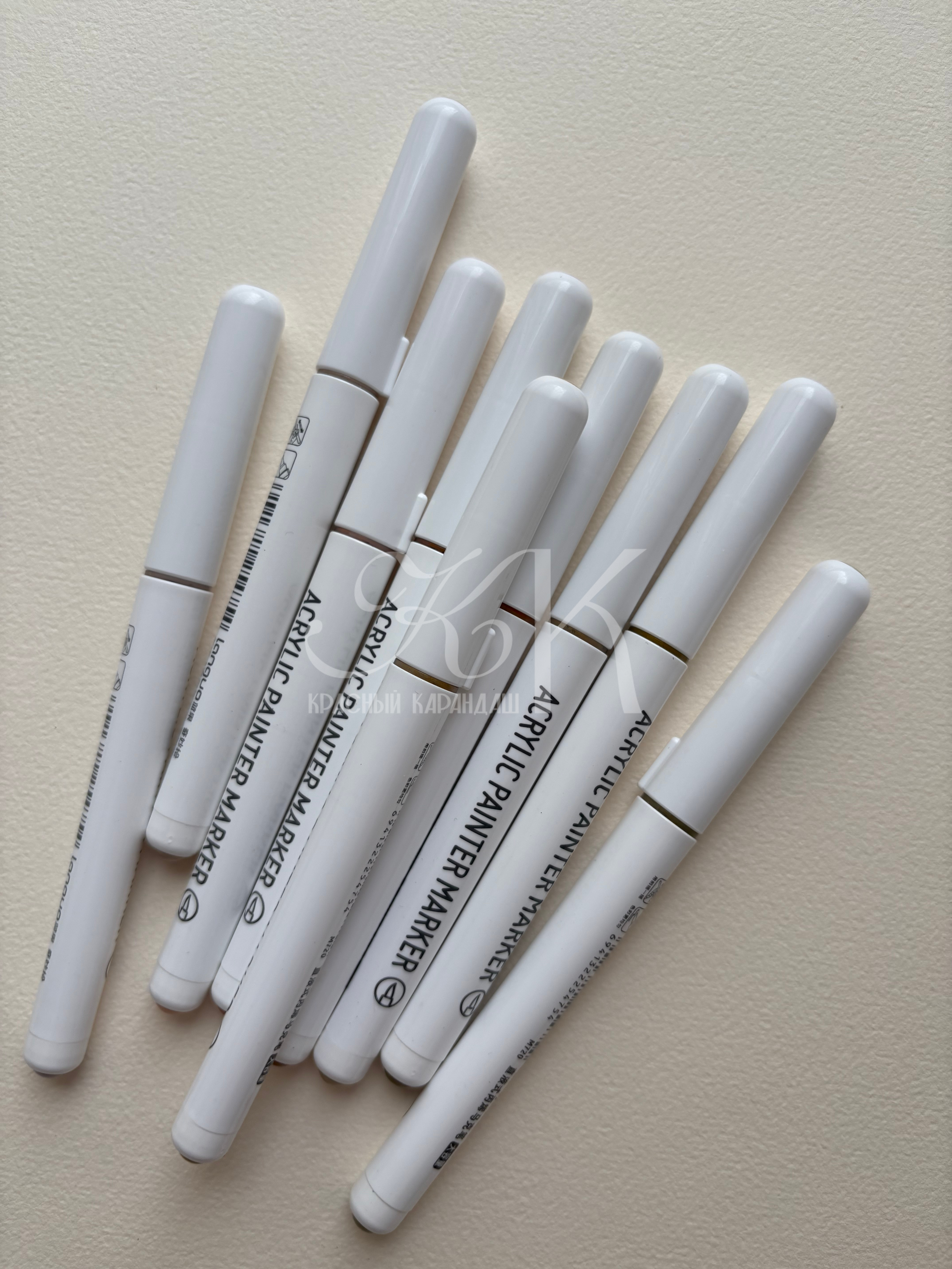 Акриловые маркеры на водной основе. Подходит для письма, рисования, декорирования. Можно использовать на любых поверхностях: холстах, бумаге, дереве, металле, картоне. Маркеры имеют высокую укрывистость с равномерным красочным слоем. После высыхания образуют плотную несмываемую плёнку. Наконечник-кисть обеспечивает линию шириной 1-3 мм.