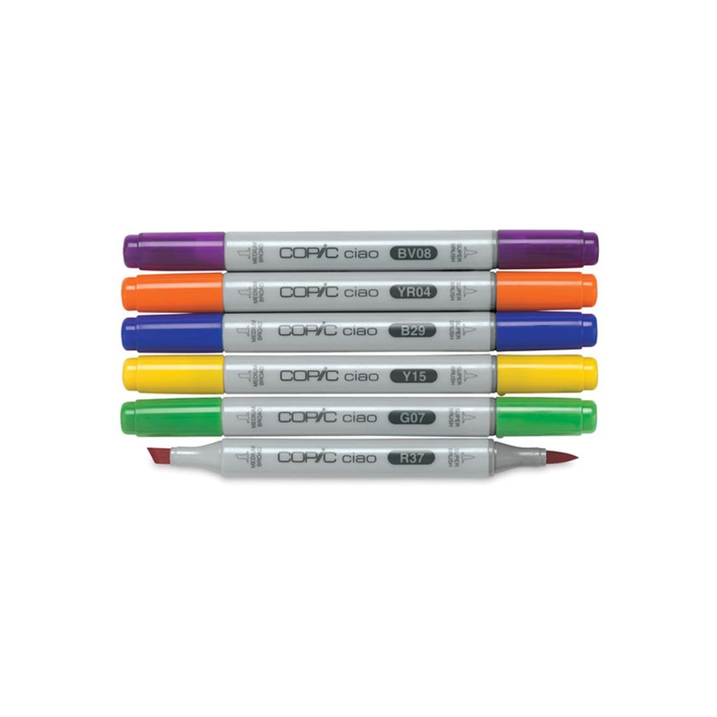 Японские маркеры Copic серии Ciao — идеальны для начинающих художников: более компактная форма, палитра из 180 цветов, меньшая цена по сравнению со старшими сериями Original и Sketch. Как и профессиональные маркеры Copic Ciao оснащены двумя наконечниками — наконечник кисть и скошенный наконечник. Маркеры Copic со спиртовыми чернилами высочаи?шего качества используются в работе дизайнерами, архитекторами, художниками и иллюстраторами.