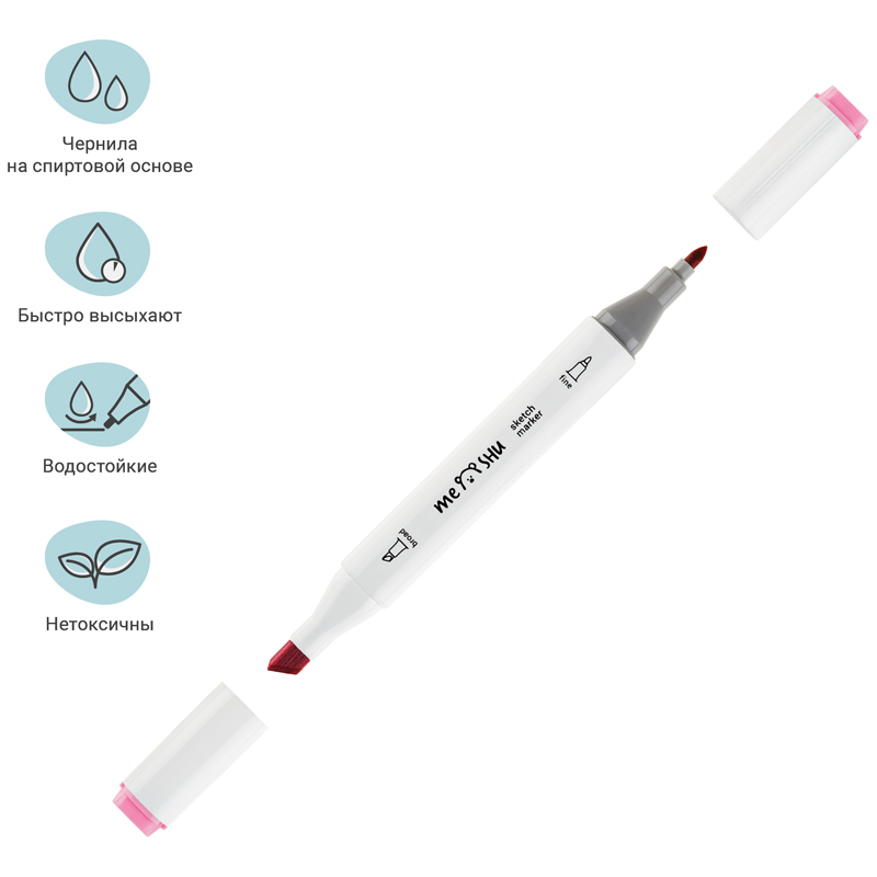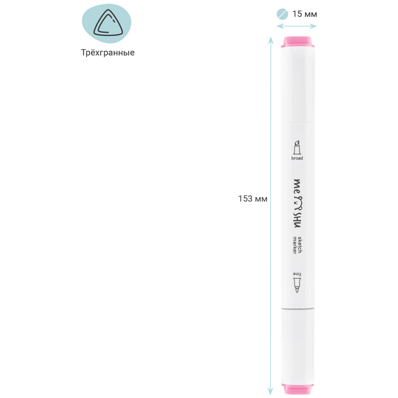Набор двусторонних маркеров для скетчинга Meshu — идеальный выбор для художников, дизайнеров, иллюстраторов и любителей скетчинга, подходят для создания аниме и манги. Эргономичный трехгранный корпус удобно лежит в руке и позволяет эффективно прорабатывать мелкие детали рисунка. Чернила на спиртовой основе — быстро высыхают, водостойкие, нетоксичны и не портят поверхность бумаги. Маркеры обладают пулевидным (2мм.) и скошенным (6 мм.) наконечниками, что позволяет прорабатывать как мелкие детали рисунка, так и закрашивать большие области.