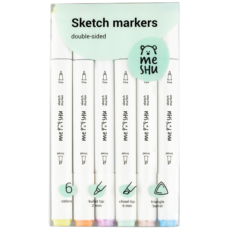 Набор двусторонних маркеров для скетчинга Meshu - идеальный выбор для художников, дизайнеров, иллюстраторов и любителей скетчинга, подходят для создания аниме и манги. Эргономичный трехгранный корпус удобно лежит в руке и позволяет эффективно прорабатывать мелкие детали рисунка. Чернила на спиртовой основе - быстро высыхают, водостойкие, нетоксичны и не портят поверхность бумаги. Маркеры обладают пулевидным (2мм) и скошенным (6 мм) наконечниками, что позволяет прорабатывать как мелкие детали рисунка. так и закрашивать большие области.