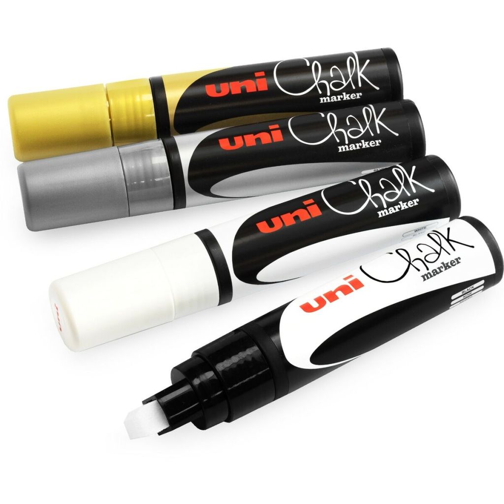 Меловой маркер Uni Chalk 17K с клиновидным наконечником, позволяет создавать линию толщиной до 15,0 мм. Основу красящего состава меловых маркеров Uni Chalk составляет специальный мел и полиакрилаты. Жидкая консистенция позволяет легко наносить меловую краску практически на любые гладкие сухие поверхности: металл, пластик, стекло, камень и фарфор. После высыхания маркер легко стирается мокрой тряпкой, но в то же время защищен от воздействия влаги и осадков. Меловые маркеры Uni Chalk могут применятся в различных сферах для всевозможных работ: в школе - для рисования на доске, в барах и кафе - для подписи ценников, создания вывесок и рекламы, на различных производствах - могут быть применены для маркировки деталей, в дизайне - для создания декора и поделок. По своей сути, Uni Chalk это тот же разноцветный мелок только в более удобной форме, которая не пачкает руки. Перед началом использования мелового маркера Uni Chalk его нужно хорошенько встряхнуть. Если кончик маркера сухой, то необходимо взять черновик, перевернуть маркер наконечником вниз и в вертикальном положении несколько раз нажать на наконечник, утопив его в корпус маркера. Таким образом мы подкачиваем красящий состав. Как только наконечник пропитается, можно приступать к использованию мелового маркера. Наконечник маркера прочный и износостойкий. Благодаря своей широкой форме подходит для оформительских работ и создания крупных надписей и узоров. В линейке меловых маркеров Uni Chalk вы найдете яркие цвета и различные типы наконечников. А благодаря красящему составу, цвета не смешиваются между собой и могут наносится поверх друг друга (при условии высыхания нижнего слоя). Кроме того, надписи, сделанные флуорисцентными меловыми маркерами Uni Chalk, очень красиво светятся в ультрафиолетовом свете. Это преимущество очень часто используют в ночных клубах для создания надписей о скидках на зеркалах или стеклах.