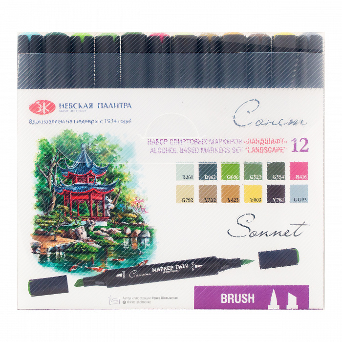 Спиртовые маркеры Сонет Twin Brush от предназначены для всех видов скетчинга, а также сложных иллюстраций, комиксов и других творческих направлений. Два пера – кисть и долото дают преимущества в работе: перо кисть - гибкое, упругое, легко управляемое, позволяет варьировать штрих от тонких линий до широких мазков, достигать мягких цветовых переходов. Долото подойдет для быстрой визуализации и заполнения больших фрагментов работы. Подача чернил маркеров контролируемая, равномерная. Полупрозрачные цвета хорошо смешиваются и накладываются друг на друга лессировками, образуя плавные градиенты и новые оттенки. Полная палитра маркеров включает 174 цвета, в том числе блендер. Серия представлена маркерами поштучно и в наборах различной комплектации.