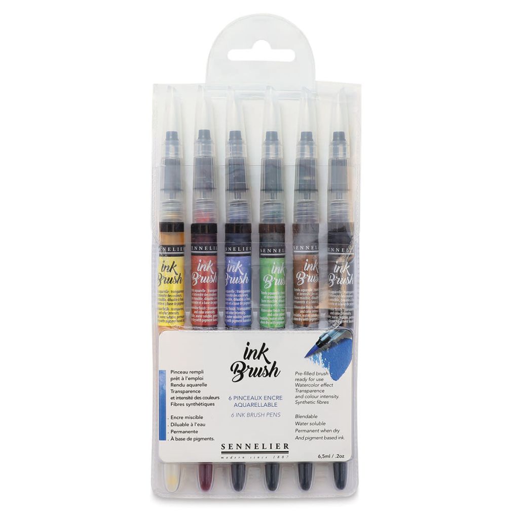 В наборе 6 кистей наполненных чернилами от бренда Sennelier. Все чернила обладают яркими укрывистыми цветами и текучей консистенцией. Чернила произведены на основе высококачественных пигментов, после высыхания устойчивы к воздействию влаги и света, но не являются несмываемыми. Для достижения акварельной прозрачности чернила можно разбавлять и смешивать с водой. Наконечник из синтетического волокна обладает универсальной круглой формой с заостренной вершинкой, позволяя использовать кисть как для точных прорисовок, каллиграфии и леттеринга, так и для больших заливок. Наконечник кисти откручивается, обеспечивая возможность повторной заправки кисти чернилами или красками на водной основе.