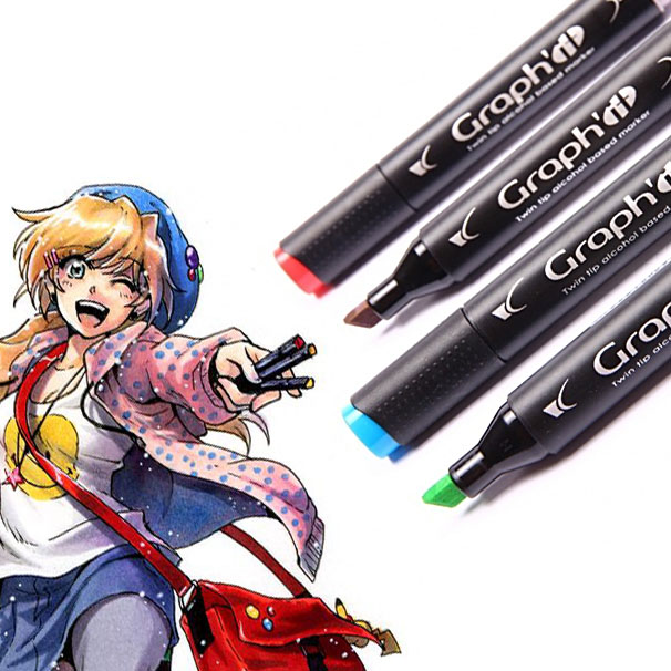 Маркер «Graph'it» - двухсторонний, на спиртовой основе. Обладает трехгранным корпусом, что делает его уникальным и не даёт скатиться с рабочей поверхности. Маркер надёжно лежит в руке. Имеет два наконечника, круглый и скошенный. Они изготовлены из полиэстера высокой прочности. Формула чернил делает маркеры устойчивыми к высыханию. Маркеры «Graph'it» идеально подходят для рисования манги, комиксов, набросков и для других направлений. Маркеры двухсторонние на спиртовой основе «Graph'it» представлены 176 различными цветовыми оттенками. Выпускаются поштучно и в наборах различной комплектации. История бренда «Graph'it» («Графит») началась в 2012 году во Франции. Основным видом деятельности является производство маркеров для художников. Продукция «Graph'it» обладает высоким качеством и идеально подходит для создания скетчей, манги, комиксов, скрапбукинга, декоративных открыток и многого другого.