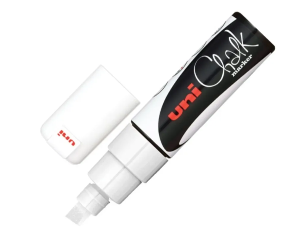 Меловой маркер Uni Chalk 8K с клиновидным наконечником, позволяет создавать линию толщиной до 8,0 мм. Основу красящего состава меловых маркеров Uni Chalk составляет специальный мел и полиакрилаты. Жидкая консистенция позволяет легко наносить меловую краску практически на любые гладкие поверхности: металл, пластик, стекло, камень и фарфор. После высыхания маркер легко стирается мокрой тряпкой, но в то же время защищен от воздействия влаги и осадков. Меловые маркеры Uni Chalk благодаря своему удобству и практичности могут применятся в различных сферах для всевозможных работ: в школе - для рисования на доске, в барах и кафе - для подписи ценников, создания вывесок и рекламы, на различных производствах - могут быть применены для маркировки деталей, в дизайне - для создания декора и поделок. По своей сути, Uni Chalk это тот же разноцветный мелок только в более удобной форме, которая не пачкает руки. Перед началом использования мелового маркера Uni Chalk для начала его нужно хорошенько встряхнуть, затем снимите защитный колпачок и можно приступать к работе. Если кончик маркера сухой, то необходимо взять черновик, перевернуть маркер наконечником вниз и в вертикальном положении несколько раз нажать на наконечник, утопив его в корпус маркера. Таким образом мы подкачиваем красящий состав. Как только наконечник пропитается, можно приступать к использованию мелового маркера. Наконечник маркера прочный и износостойкий. Благодаря своей широкой форме подходит для оформительских работ и создания крупных надписей и узоров. В линейке меловых маркеров Uni Chalk вы найдете яркие цвета и различные типы наконечников. А благодаря красящему составу, цвета не смешиваются между собой и могут наносится поверх друг друга (при условии высыхания нижнего слоя). Кроме того, надписи, сделанные меловыми маркерами Uni Chalk, очень красиво светятся в ультрафиолетовом свете. Это преимущество очень часто используют в ночных клубах для создания надписей о скидках на зеркалах или стеклах. Единственным требованием меловых маркеров является использование на сухих и гладких поверхностях.