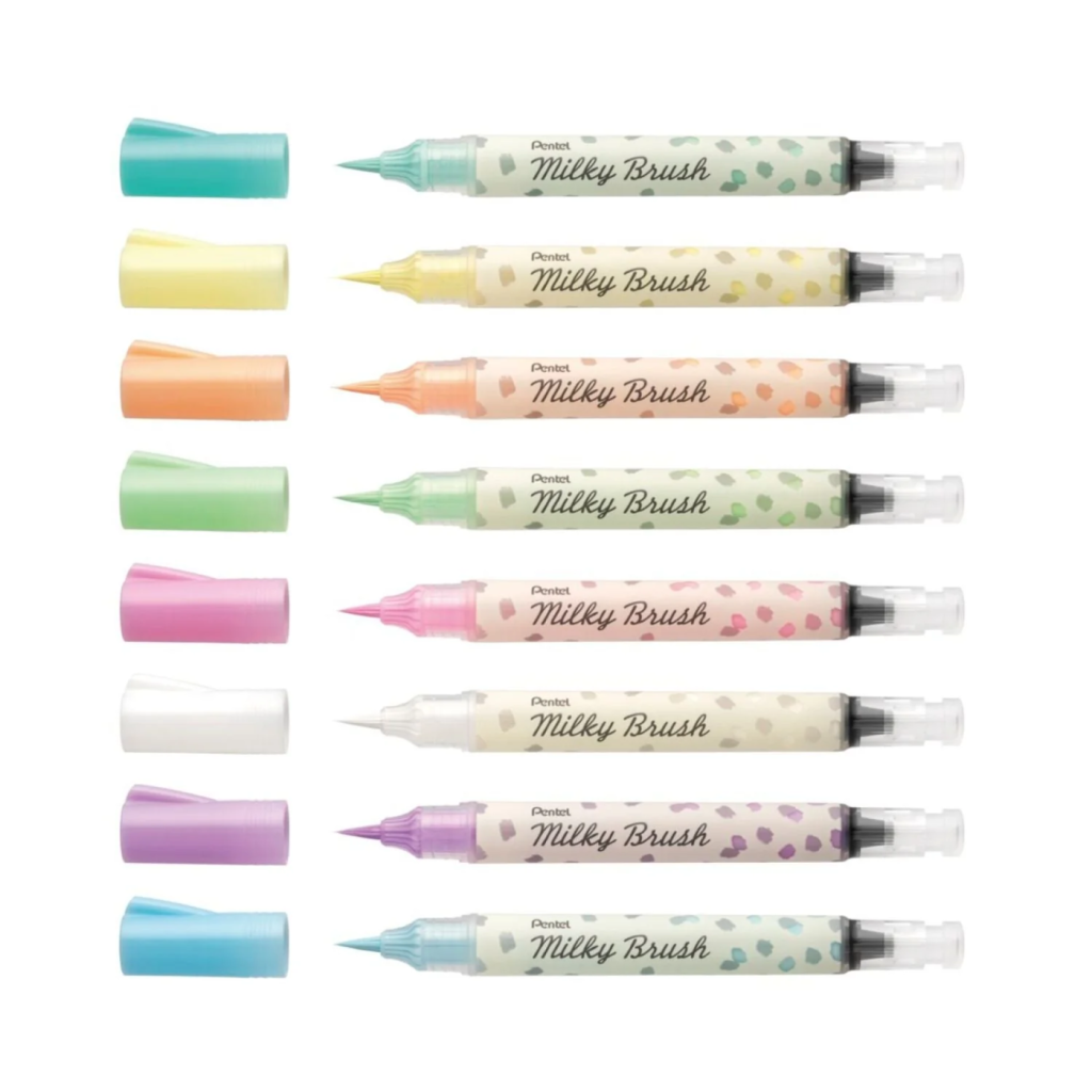 Pentel Milky Brush — это нейлоновые кисти, заправленные чернилами пастельных цветов. Перед первым использованием Brush необходимо активировать — это гарантия качества. Для активации тщательно встряхните кисть, снимите колпачок и несколько раз нажмите на кнопку подкачки чернил на противоположном конце корпуса, пока чернила как следует не пропитают наконечник. Наконечник кисти изготовлен из высококачественного нейлона, позволяет рисовать линии от 1 мм до 2 мм. Нейлон, в отличие от натуральных материалов менее подвержен деформации и истончению, а значит кисть прослужит долго. Съемный колпачок плотно защелкивается и обеспечивает дополнительную защиту от протечки чернил.