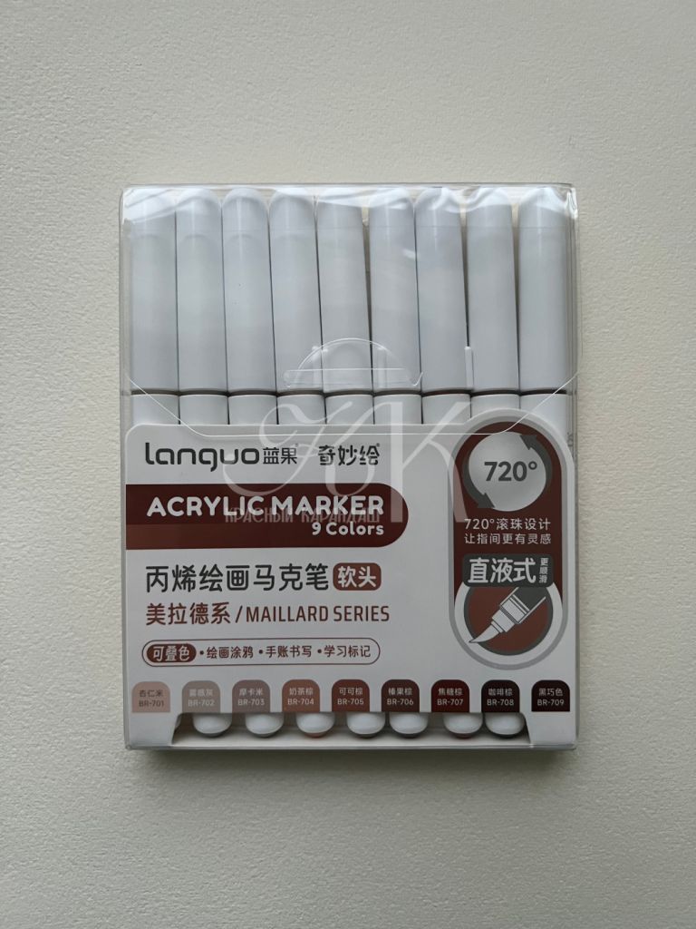 Акриловые маркеры на водной основе. Подходит для письма, рисования, декорирования. Можно использовать на любых поверхностях: холстах, бумаге, дереве, металле, картоне. Маркеры имеют высокую укрывистость с равномерным красочным слоем. После высыхания образуют плотную несмываемую плёнку. Наконечник-кисть обеспечивает линию шириной 1-3 мм.