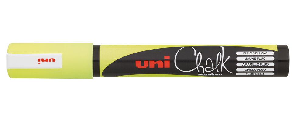 Меловой маркер Uni Chalk 5M с овальным наконечником, позволяет создавать линию от 1,8 до 2,5 мм. Основу красящего состава меловых маркеров Uni Chalk составляет специальный мел и полиакрилаты. Жидкая консистенция позволяет легко наносить меловую краску практически на любые гладкие сухие поверхности: металл, пластик, стекло, камень и фарфор. После высыхания маркер легко стирается мокрой тряпкой, но в то же время защищен от воздействия влаги и осадков. Меловые маркеры Uni Chalk могут применятся в различных сферах для всевозможных работ: в школе - для рисования на доске, в барах и кафе - для подписи ценников, создания вывесок и рекламы, на различных производствах - могут быть применены для маркировки деталей, в дизайне - для создания декора и поделок. По своей сути, Uni Chalk это тот же разноцветный мелок только в более удобной форме, которая не пачкает руки. Перед началом использования мелового маркера Uni Chalk его нужно хорошенько встряхнуть. Если кончик маркера сухой, то необходимо взять черновик, перевернуть маркер наконечником вниз и в вертикальном положении несколько раз нажать на наконечник, утопив его в корпус маркера. Таким образом мы подкачиваем красящий состав. Как только наконечник пропитается, можно приступать к использованию мелового маркера. Наконечник маркера прочный и износостойкий. Благодаря своей широкой форме подходит для оформительских работ и создания крупных надписей и узоров. В линейке меловых маркеров Uni Chalk вы найдете яркие цвета и различные типы наконечников. А благодаря красящему составу, цвета не смешиваются между собой и могут наносится поверх друг друга (при условии высыхания нижнего слоя). Кроме того, надписи, сделанные флуорисцентными меловыми маркерами Uni Chalk, очень красиво светятся в ультрафиолетовом свете. Это преимущество очень часто используют в ночных клубах для создания надписей о скидках на зеркалах или стеклах.