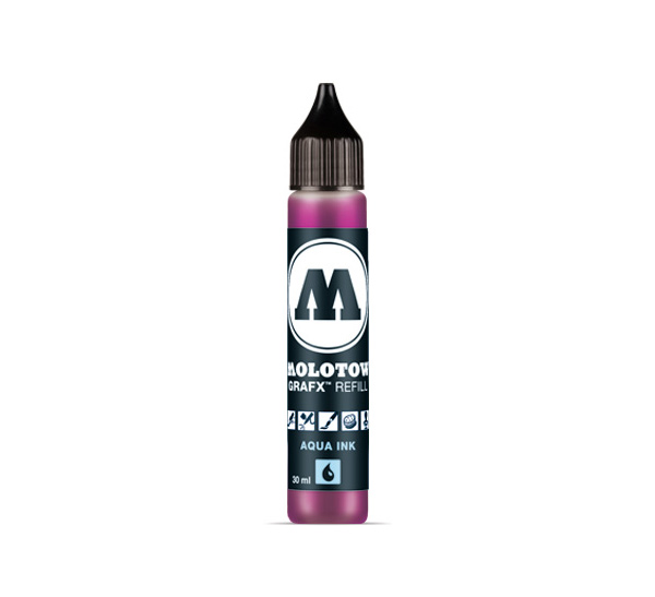 Заправка для маркеров Molotow AQVA GRAF-X. Объем 30 мл. В основе пищевой краситель (подходит для детского использования). Смывается с кожи водой с мылом. Смешивающиеся цвета. Водорастворимая основа.