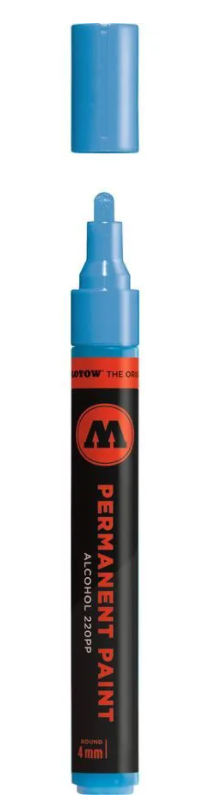 Маркер Molotow 220 PP — стандартный маркер универсального применения. Маркер заполнен высокопигментированной краской, которая гарантирует высокую укрывистость, хорошее держание на любых поверхностях и быстрое высыхание. Идеальный инструмент для тэггинга. Выпускается в 16 цветах. Помповая система обеспечивает контролируемую подачу краски, а специальный колпачок Sidekick легко открывается одним пальцем и предотвращает высыхание пера. Внутри корпуса расположен специальный шарик для размешивания чернил, перед использованием рекомендуется встряхнуть маркер.
