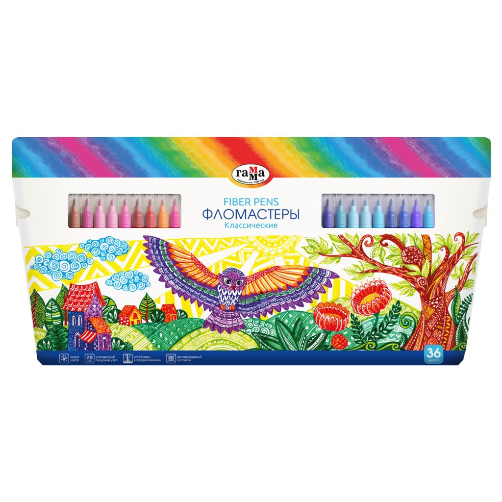 Фломастеры ГАММА серии «Классические» отлично подойдут для детского творчества. В наборе 12 насыщенных цветов: чёрный, зелёный, красный, синий, жёлтый, коричневый, розовый, малиновый, фиолетовый, оранжевый, салатовый, голубой. Чернила на основе воды и пищевых красителей легко смываются с одежды и рук и избавят от хлопот после рисования. Колпачок фломастера вентилируемый, что поможет избежать негативных сценариев при проглатывании его ребенком. Корпус круглой формы диаметром 10 мм изготовлен из безопасного полипропилена и имеет удобную круглую зону захвата. Тип наконечника – конический. Толщина пишущего узла – 2,8 мм позволяет наносить как тонкие, так и толстые линии для создания ярких рисунков.