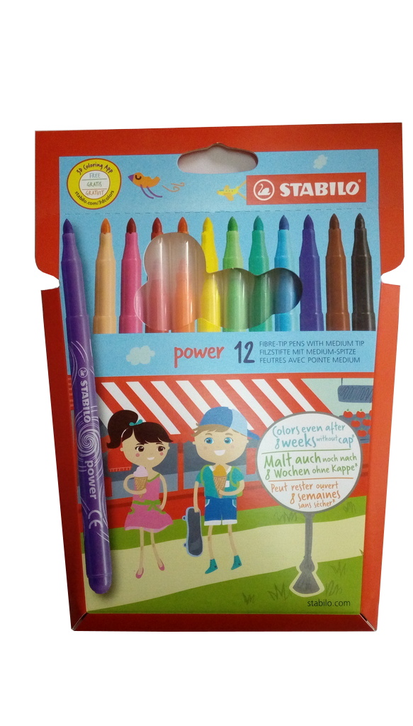 Набор фломастеров Stabilo Swano Power. 12 ярких цветов. Толщина линии 2 мм. Не высыхают до 5 недель без колпачка. Идеально подходят для детей. Упаковка: пластик.