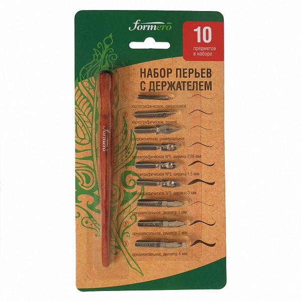 Набор для каллиграфии из 10 предметов включает в себя необходимые аксессуары для оформительских работ, написания текстов различными шрифтами. Универсальный держатель из натурального дерева орехового цвета с эргономичной формой ручки обеспечивает удобное и комфортное письмо. Девять перьев с различной формой наконечника позволяют разнообразить подход к творчеству. В набор входят следующие виды перьев: • 1 - остроконечное, сверхтонкое; • 2 - остроконечное, тонкое; • 3 - остроконечное, универсальное; • 4 - плоское № 5, ширина 0,65 мм; • 5 - плоское № 3, ширина 1,5 мм; • 6 - плоское № 1, ширина 3 мм; • 7 - орнаментальное ? 1 мм; • 8 - орнаментальное ? 2 мм; • 9 - орнаментальное ? 4 мм.