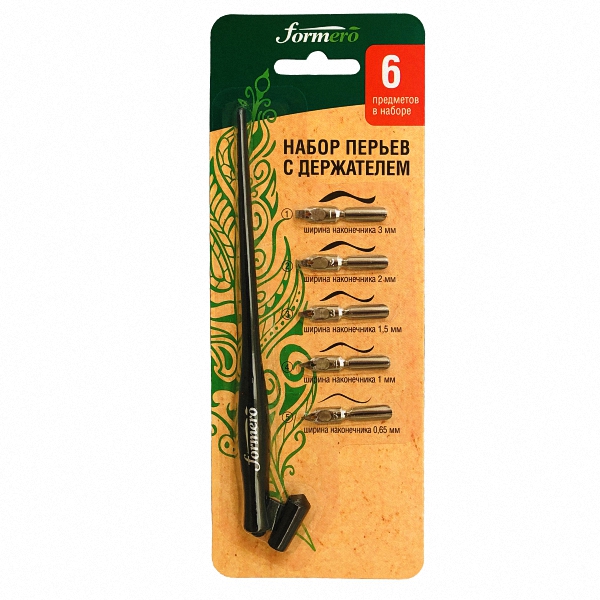 Набор для каллиграфии из 6 предметов включает в себя необходимые аксессуары для оформительских работ, написания текстов различными шрифтами. Пластиковый держатель с фланцем для наклонного шрифта с эргономичной формой ручки в комплекте обеспечивает удобное и комфортное письмо. Пять классических плоских перьев для каллиграфии и леттеринга с различной шириной наконечника позволяют разнообразить подход к творчеству. В набор входят перья следующих размеров: • № 1 - 3 мм; • № 2 - 2 мм; • № 3 - 1,5 мм; • № 4 - 1 мм; • № 5 - 0,65 мм.