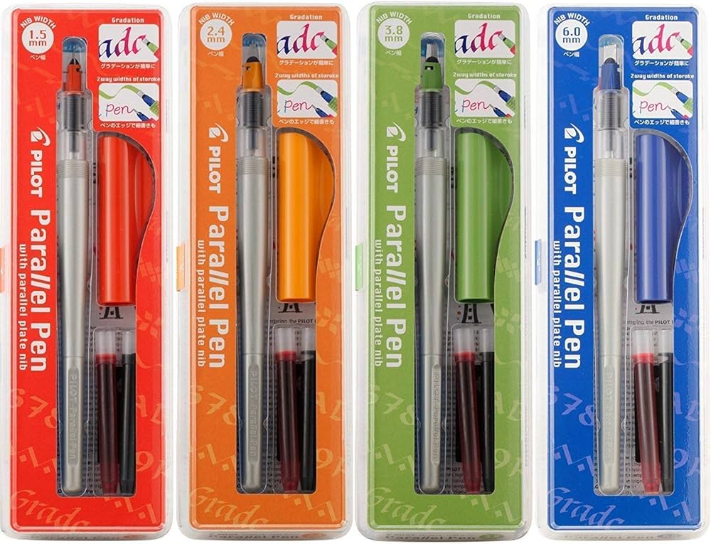 Популярная и редкая в России ручка для каллиграфических работ Pilot Parallel Pen. Перьевая ручка с картриджами - это несомненно практично, особенно для тренировок и оттачивания умений каллиграфа, к тому же она незаменима для работы с большими объемами текстов. Особая конструкция пера представляет собой две параллельные пластины, что позволяет получать более гармоничный и отточенный штрих, чем у подобных ручек. Можно писать всем срезом пера (широкий штрих) или углом пера (тонкий штрих). К тому же в диапазоне ширины перьев Pillot parallel pen явно лидер. Ширина пера указана в артикуле 1.5мм, 2.4мм, 3.8мм., 6.0мм. Уникальный состав чернил позволяет смешивать их, получая красивые градиентные переходы. В комплекте ручка, колпачок, плёнка для очистки пера от остатков чернил, два картриджа, конвертор-пипетка для промывки ручки от остатков чернил.