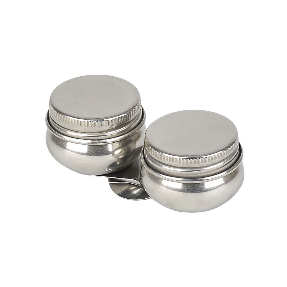 Двойная масленка имеет крепление на палитру и предназначена для хранения разбавителя для масляных красок. Покрыта антикоррозийным составом, который предохраняет ее от воздействия растворителя. Две емкости позволяют использовать несколько разбавителей, комбинации разбавителя, льняного масла или лака.