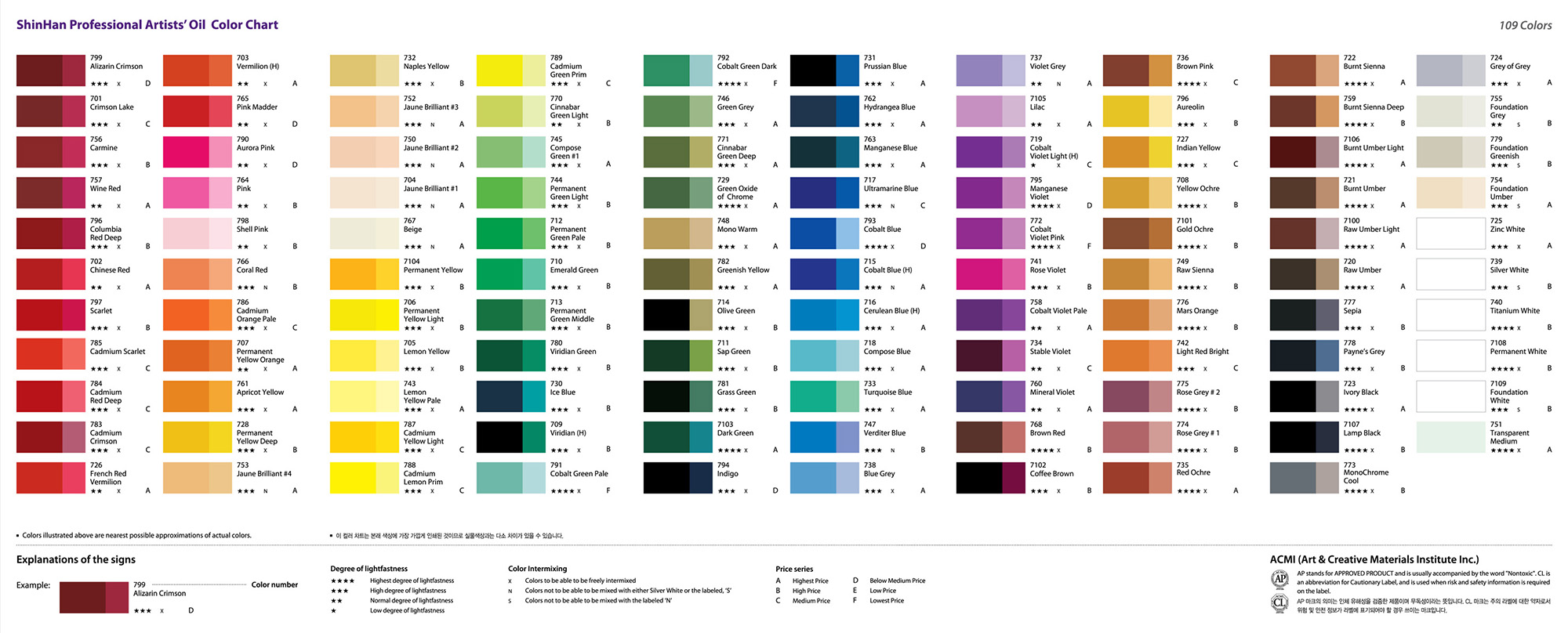 О серии: серия масляных красок OIL COLOR PRO разработана для самых взыскательных художников. Богатая палитра из 109 цветов предполагает неограниченные возможности воплощения в живописи, а а высокая концентрация пигментов обеспечивает чистое смешивание красок для получения новых оттенков. В линейке представлено 109 цветов. В наборе 12 цветов в тубах по 50 мл. Применение: для масляной живописи в различных техниках. Производство: компания из Южной Кореи ShinHan Art International Inc славится своей продукцией, предназначенной для иллюстраторов, аниматоров, дизайнеров и архитекторов. Компания была основана в 1967 году и на тот момент называлась Haneel. Сегодня ShinHan Art International Inc славится во всем мире превосходным качеством своей продукции. Особенностью данной марки является внимание к деталям и дизайну. Применение современных технологий и следование традициям производства, позволяют создавать эргономичные, удобные и сверхнадежные канцелярские принадлежности. Продукция компании используются в различных сферах и популярна среди профессиональных художников, а также любителей творчества и хобби.