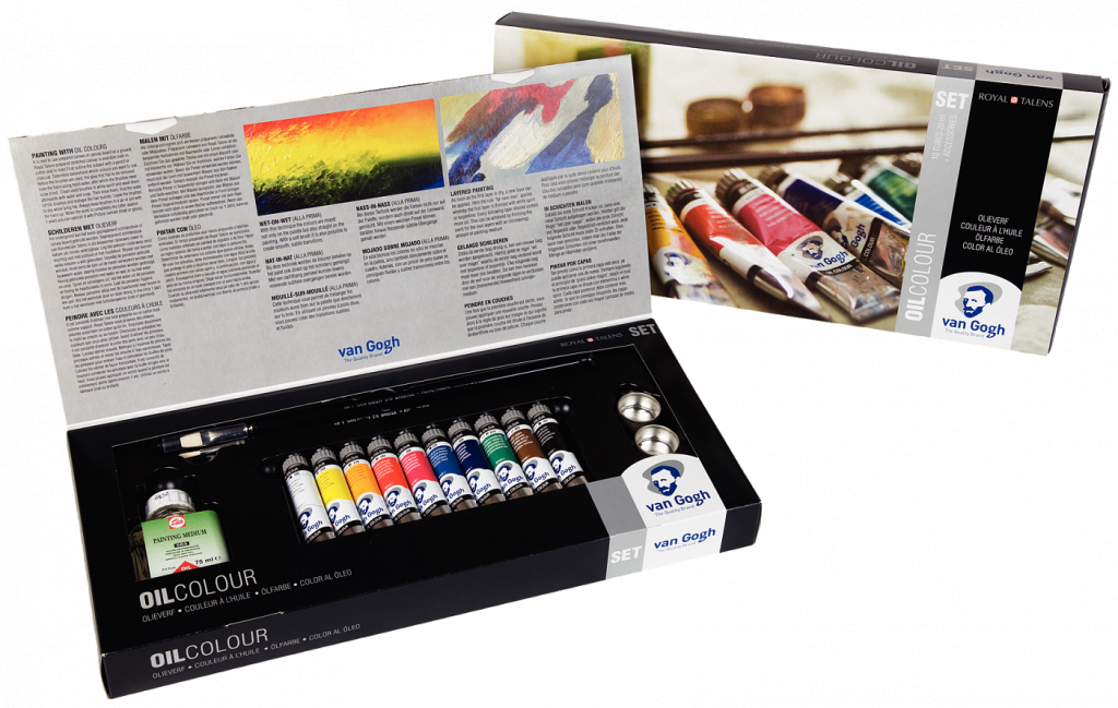 О серии: художественные масляные краски Van Gogh отличаются достаточно высоким содержанием пигмента в сочетании с льняным маслом высокого качества. Масло Van Gogh представлено сбалансированной палитрой из 66 цветов. Краски данной серии представлены поштучно и в наборах различной комплектации. Комплектация набора: в данный набор входит 10 базовых цветов масляной краски Van Gogh в тубах по 20 мл, медиум для масляных красок, плоская кисть №8 из свиной щетины, круглая кисть №4 из свиной щетины и двойная масленка. Набор упакован в картонную коробку. Характеристика: Van Gogh – это художественные масляные краски, изготовленные на льняном масле высшей степени очистки. Обладают достаточно высокой концентрацией пигмента. Серия красок состоит из ярких и насыщенных оттенков. Цвета имеют равную степень плотности и поэтому хорошо смешиваются друг с другом. Благодаря высокой плотности мазки не расплываются и хорошо видны на картине. Масло Van Gogh не выцветает десятилетиями. Производство: масляные краски Van Gogh производятся в городе Апелдорн голландской компанией ROYAL TALENS. Основал её Мартин Таленс (Marten Talens) в 1899 году. Титул «Royal» (Ройал, королевский) компания получила в 1949 году от королевской четы за высокое качество продукции и следование традициям. ROYAL TALENS производит все виды художественных красок и является одним из ведущих производителей в своей отрасли.