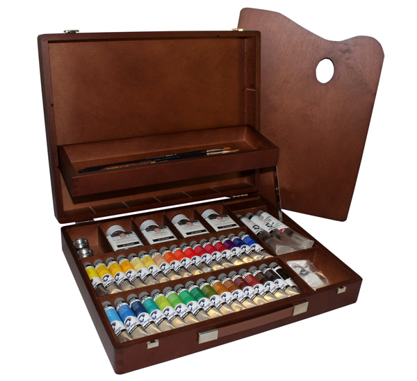 О серии: художественные масляные краски Van Gogh отличаются достаточно высоким содержанием пигмента в сочетании с льняным маслом высокого качества. Масло Van Gogh представлено сбалансированной палитрой из 66 цветов. Краски данной серии представлены поштучно и в наборах различной комплектации. Комплектация набора: данный набор является самым большим из тех, которые представлены с масляными красками Van Gogh. В набор входит 32 цвета масляной краски Van Gogh в тубах по 20 мл, 2 цвета (титановые и цинковые белила) в тубах по 60 мл, медиум для масляных красок, уайт-спирит без запаха, глянцевый лак, ретушный лак, текстурная паста, 5 кистей различной формы, мастихин, уголь (3 шт), двойная масленка, деревянная палитра, салфетка. Набор упакован в подарочный короб из темного дерева. Характеристика: Van Gogh – это художественные масляные краски, изготовленные на льняном масле высшей степени очистки. Обладают достаточно высокой концентрацией пигмента. Серия красок состоит из ярких и насыщенных оттенков. Цвета имеют равную степень плотности и поэтому хорошо смешиваются друг с другом. Благодаря высокой плотности мазки не расплываются и хорошо видны на картине. Масло Van Gogh не выцветает десятилетиями. Производство: масляные краски Van Gogh производятся в городе Апелдорн голландской компанией ROYAL TALENS. Основал её Мартин Таленс (Marten Talens) в 1899 году. Титул «Royal» (Ройал, королевский) компания получила в 1949 году от королевской четы за высокое качество продукции и следование традициям. ROYAL TALENS производит все виды художественных красок и является одним из ведущих производителей в своей отрасли.