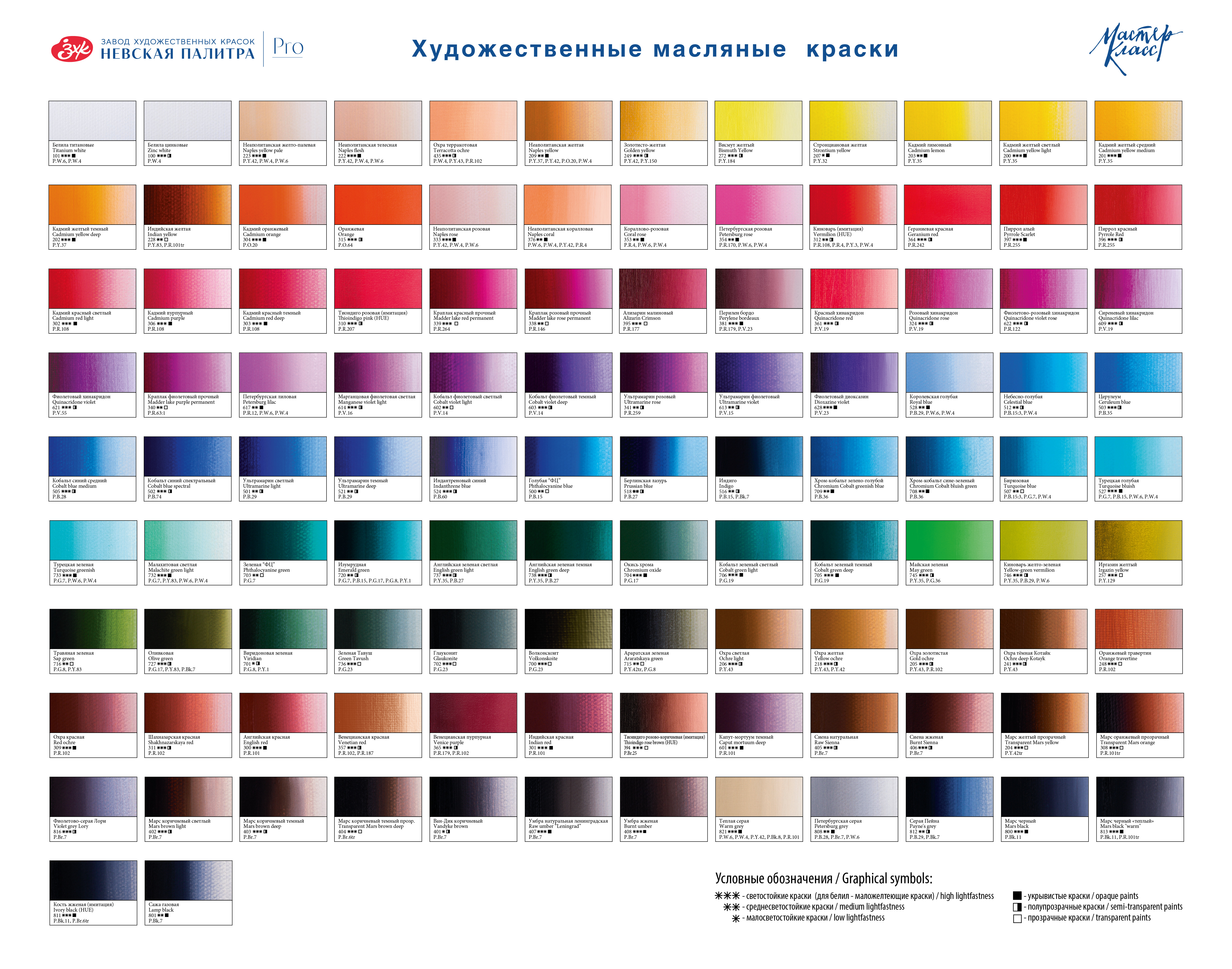 Палитра цветов, выпускаемых в серии «Мастер-класс», состоит из традиционных для художников красок на основе натуральных земляных, кадмиевых, кобальтовых и железоокисных пигментов. Сотрудники завода художественных красок Невская палитра постоянно работают над расширением палитры масла «Мастер-класс», и каждый год в ассортимент вводятся новые цвета. Масло «Мастер-класс» отличается чистотой цвета и высокой светостойкостью. Краска не меняет изначального тона после высыхания, что позволяет использовать ее в реставрационных работах. Серия масла «Мастер-класс» представлена поштучно в тубах по 46 миллилитров и в различных наборах. Масло «Мастер-класс» производится заводом художественных красок Невская палитра, расположенным в городе Санкт-Петербурге. Завод уже более 80 лет выпускает продукцию для профессиональных художников и любителей творчества.