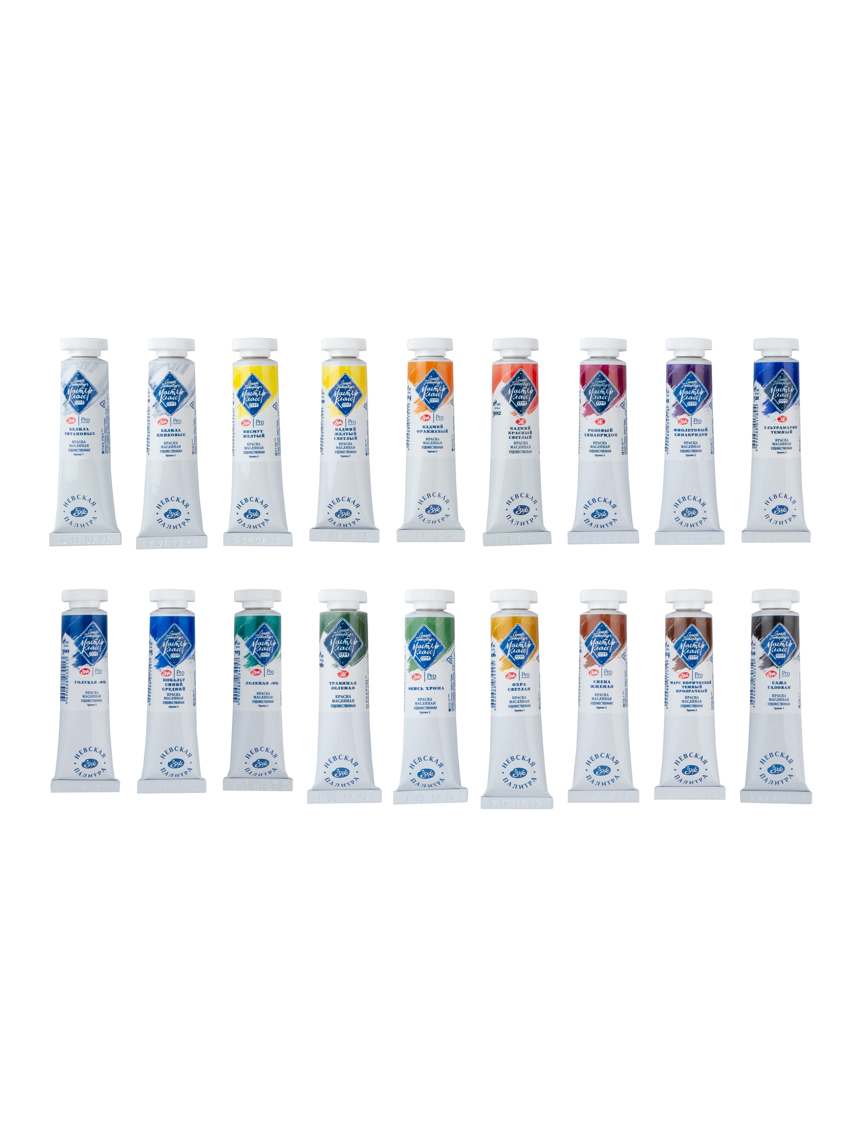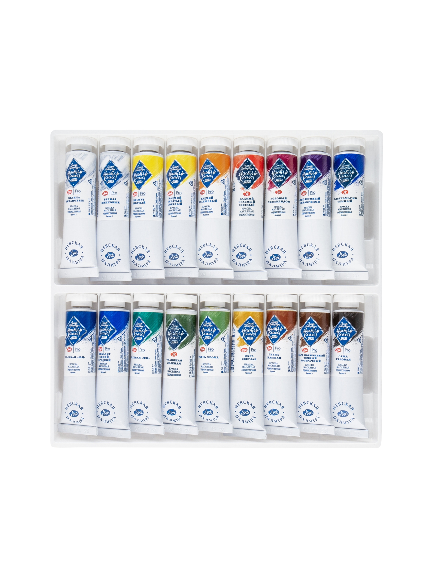 Масляные краски «Мастер-класс» разработаны для профессиональных художников. Изготавливаются по традиционным рецептурам на основе высококачественных пигментов, связующего – специально обработанного льняного масла и натуральных смол, положительным образом влияющих на свойства красок. Тонкодисперсные краски с высокой концентрацией пигмента превосходно смешиваются между собой. Обладают густой консистенцией, позволяющей работать пастозно. Яркость и чистота цвета, высокая светостойкость красок обусловлены применением ценных для живописи неорганических (природные красящие земли, кадмиевые, кобальтовые, железоокисные) и органических пигментов высокого качества. 2 вида белил с составе набора; 16 оттенков из18-ти - монопигментные; натуральные кадмии и кобальт в составе набора; 13 оттенков из 18-ти обладают максимальной светостойкостью; в наборе представлены как укрывистые, так и лессировочные цвета. Состав набора: 101 Белила титановые | 100 Белила цинковые | 272 Висмут желтый | 200 Кадмий желтый светлый | 304 Кадмий оранжевый | 302 Кадмий красный светлый | 324 Розовый хинакридон | 621 Фиолетовый хинакридон | 521 Ультрамарин темный | 500 Голубая «ФЦ» | 505 Кобальт синий средний | 703 Зеленая ФЦ | 716 Травяная зеленая | 704 Окись хрома | 206 Охра светлая | 406 Сиена жженая | 404 Марс коричневый темный прозрачный | 801 Сажа газовая