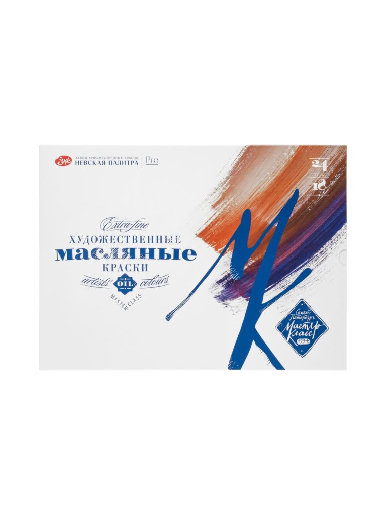 Масляные краски «Мастер-класс» разработаны для профессиональных художников. Изготавливаются по традиционным рецептурам на основе высококачественных пигментов, связующего – специально обработанного льняного масла и натуральных смол, положительным образом влияющих на свойства красок. Тонкодисперсные краски с высокой концентрацией пигмента превосходно смешиваются между собой. Обладают густой консистенцией, позволяющей работать пастозно. Яркость и чистота цвета, высокая светостойкость красок обусловлены применением ценных для живописи неорганических (природные красящие земли, кадмиевые, кобальтовые, железоокисные) и органических пигментов высокого качества. 2 вида белил в составе набора 20 оттенков из 24-х - монопигментные; натуральные кадмии и кобальт в составе набора; 18 оттенков из 24-х обладают максимальной светостойкостью. Состав набора: 101 Белила титановые | 100 Белила цинковые | 222 Неаполитанская телесная | 272 Висмут желтый | 200 Кадмий желтый светлый | 304 Кадмий оранжевый | 302 Кадмий красный светлый | 339 Краплак красный прочный | 361 Красный хинакридон | 324 Розовый хинакридон | 621 Фиолетовый хинакридон | 528 Королевская голубая | 505 Кобальт синий средний | 521 Ультрамарин темный | 500 Голубая «ФЦ» | 703 Зеленая «ФЦ» | 704 Окись хрома | 716 Травяная зеленая | 206 Охра светлая | 405 Сиена натуральная | 406 Сиена жженая | 404 Марс коричневый темный прозрачный | 408 Умбра жженая | 801 Сажа газовая